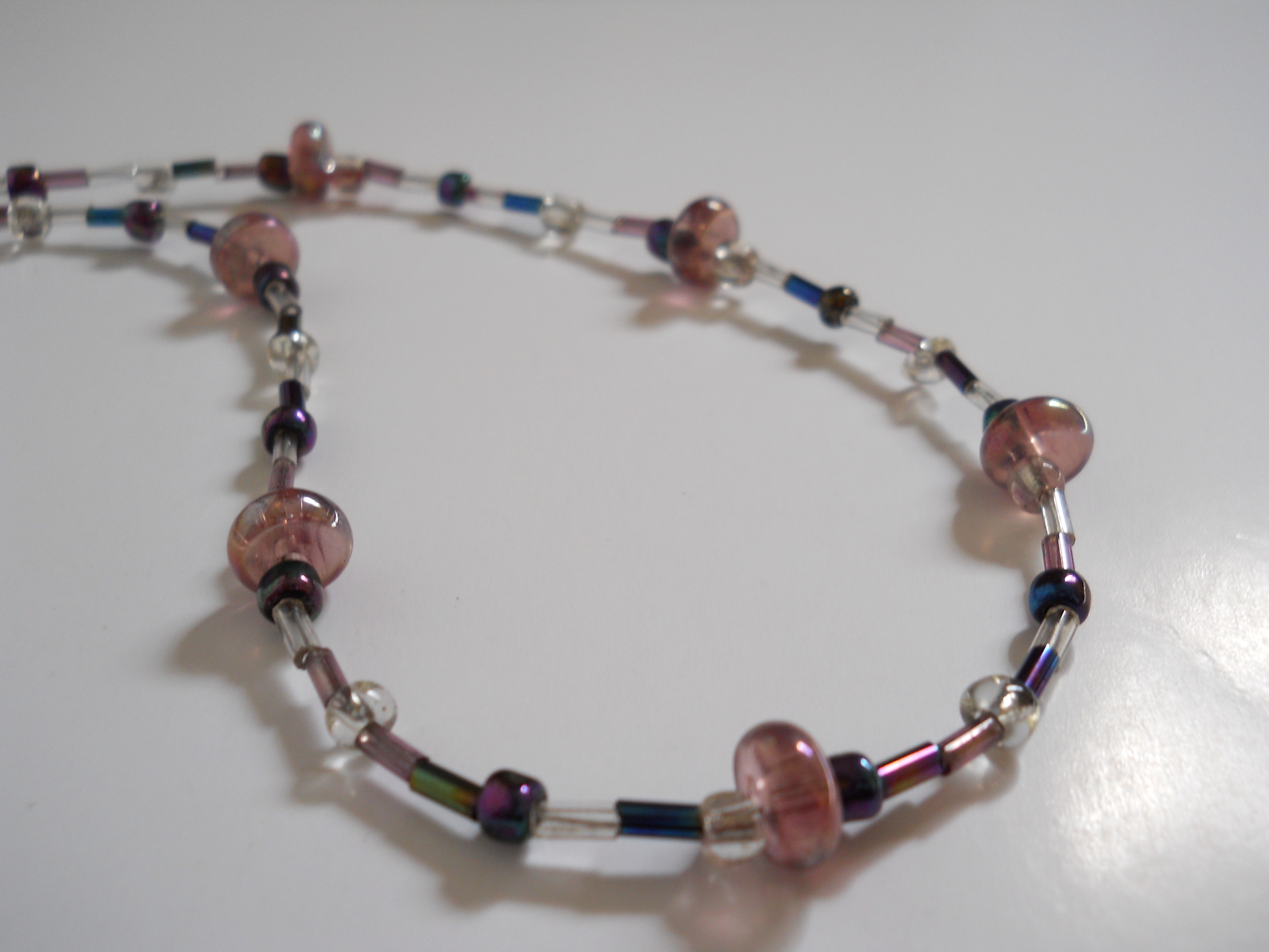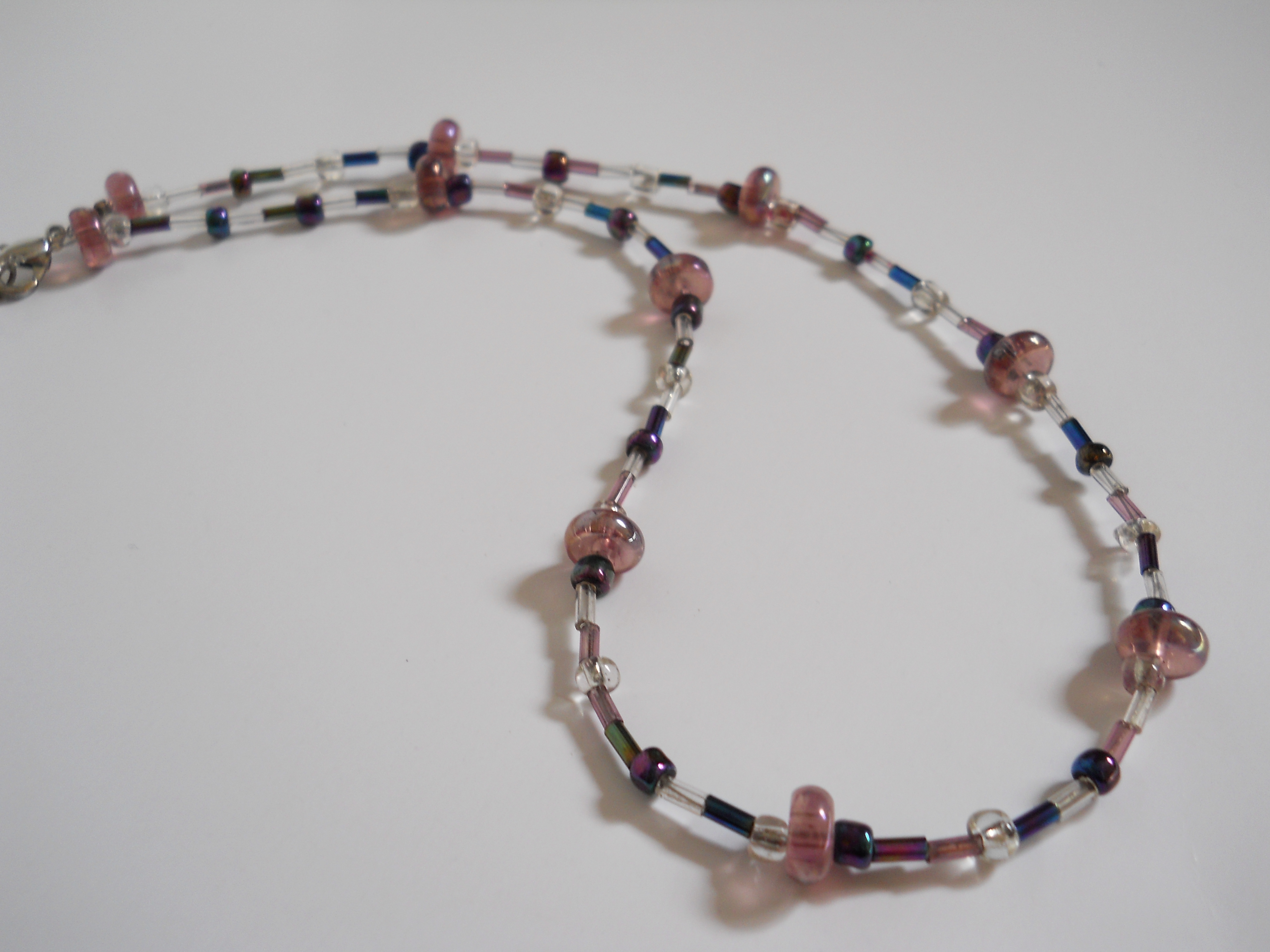 All Handmade with Metallic and Silver Czech Glass E-Beads, Metallic and Clear Bugle Beads and Pink Glass Disk Beads! Connected with a Lobster Clasp