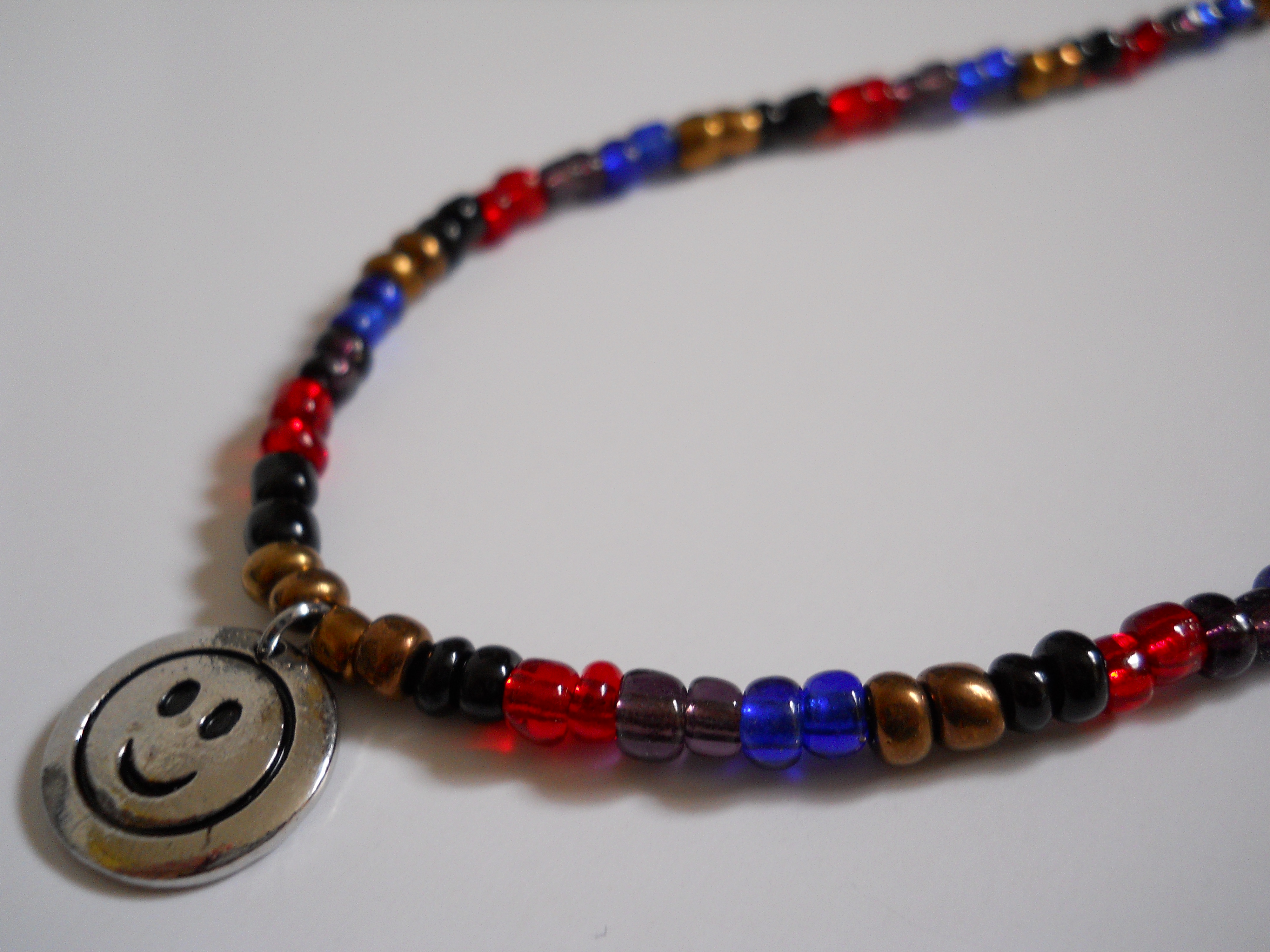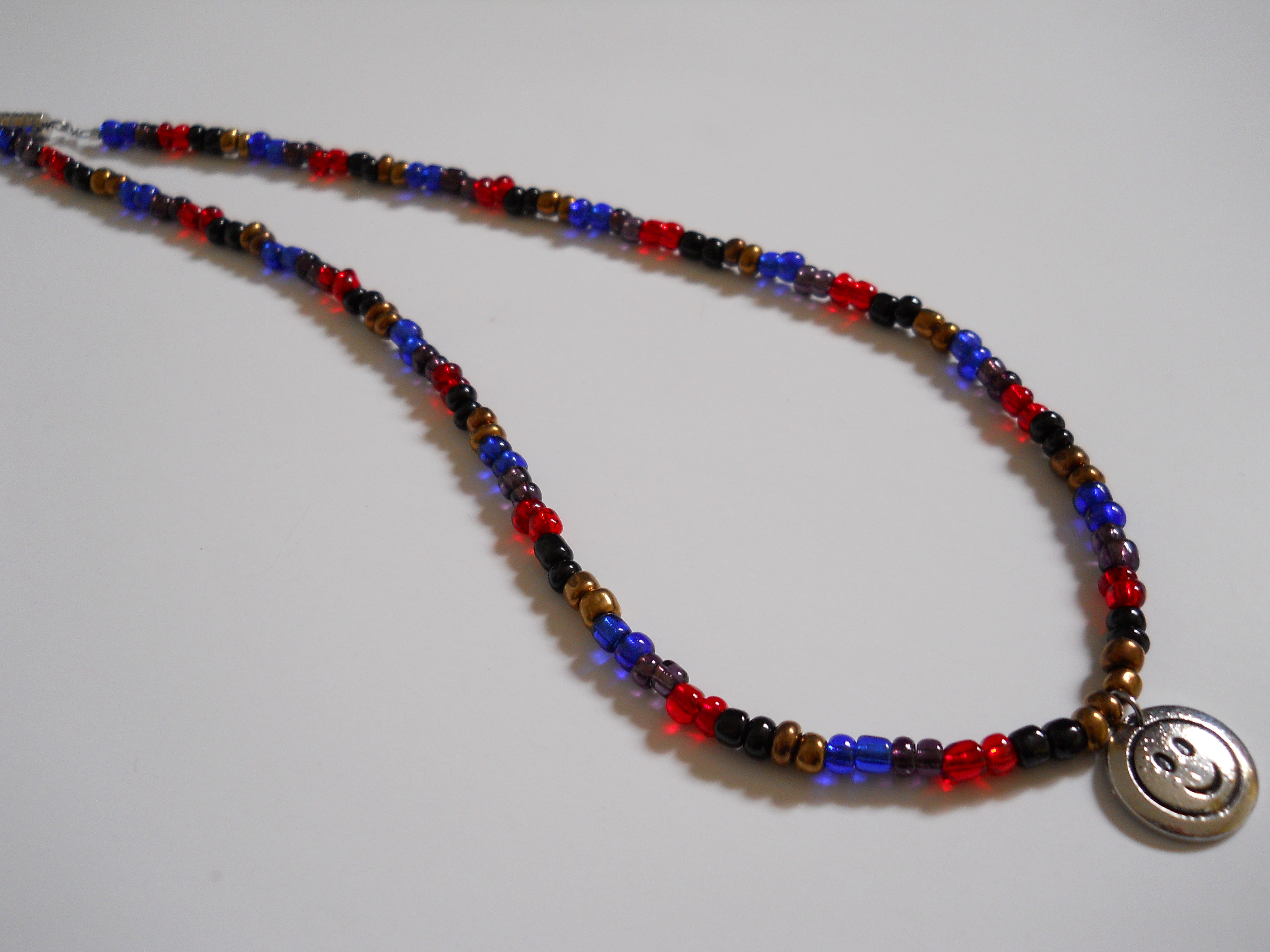 This necklace is sure to bring a smile to your face! All Handmade with vivid Blue, Black, Gold, Purple and Red Czech Glass E-Beads, it is centered with a Metal Smiley Charm! Connected by a Barrel Clasp