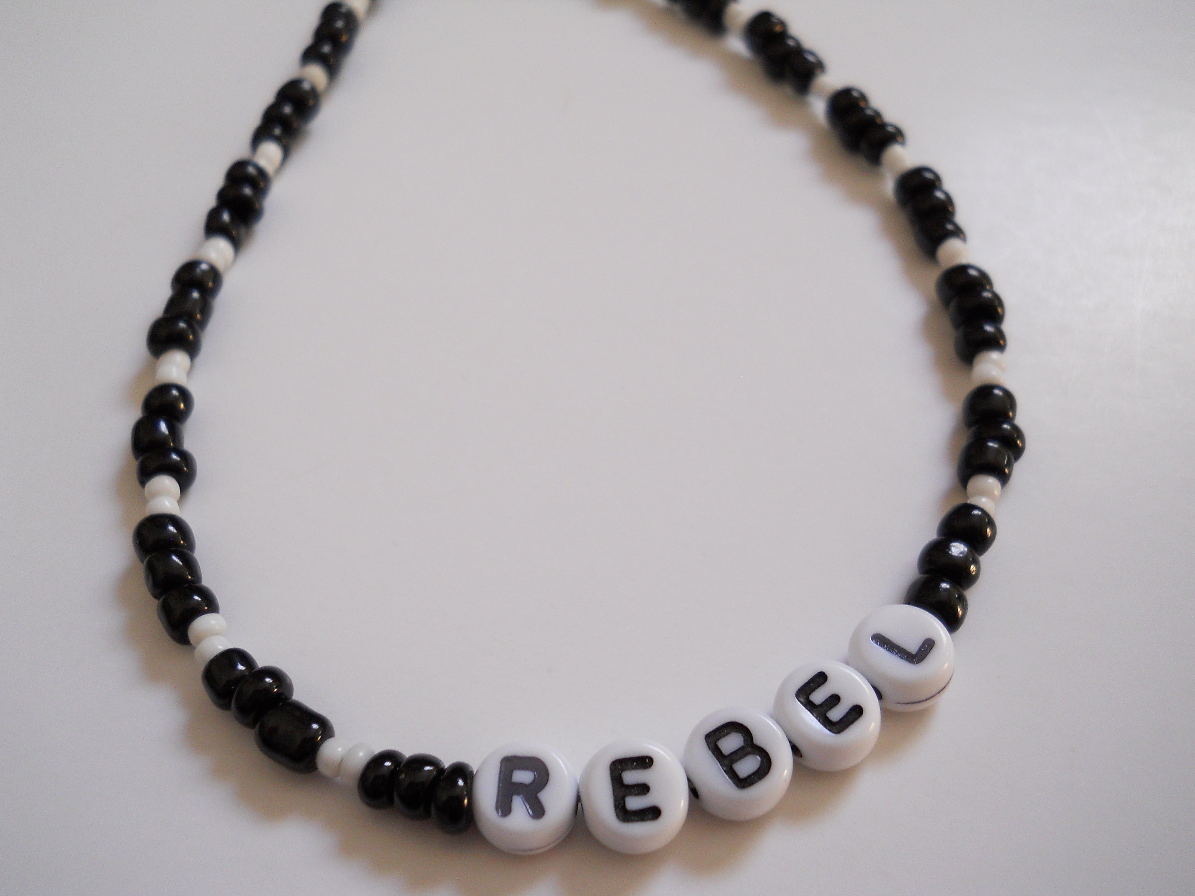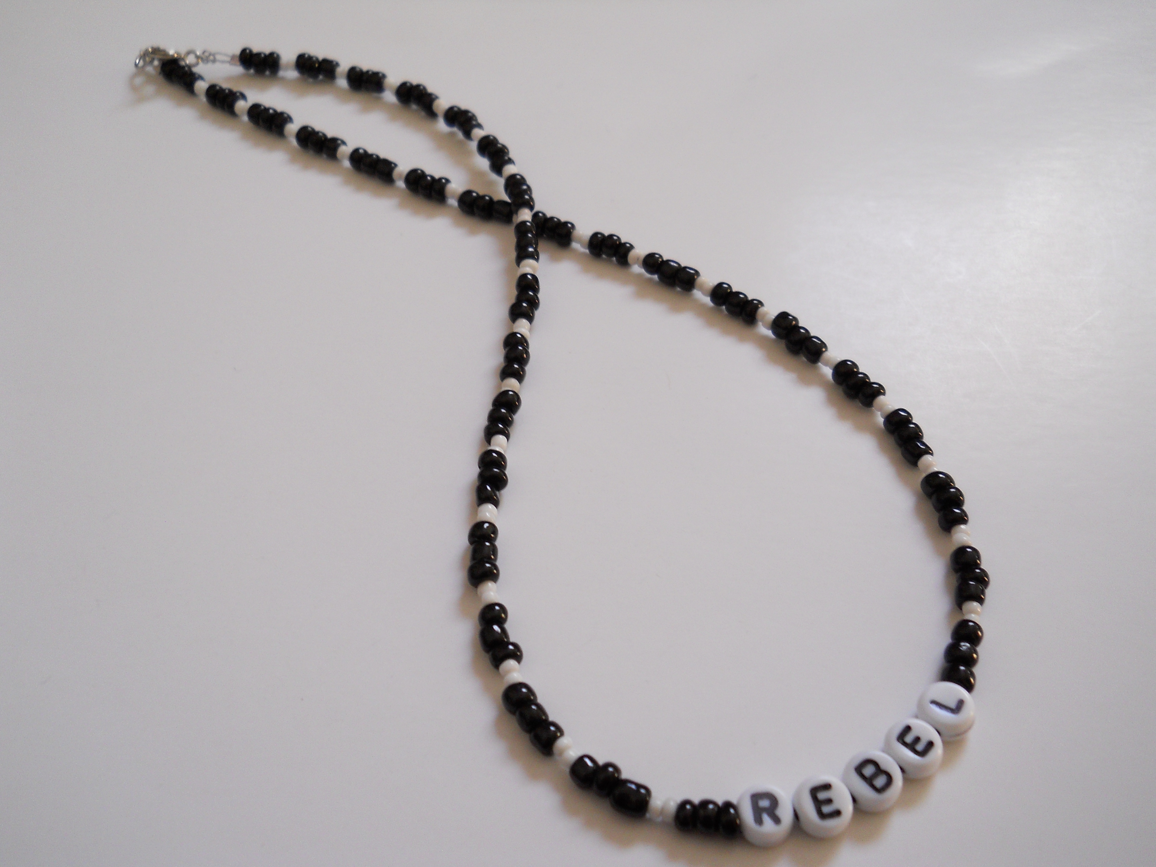 Voice your rebellious status with this necklace! Handmade with Black Czech glass E-beads White seed Beads and centered with Acrylic Letter Beads. Connected by a Spring Ring Clasp