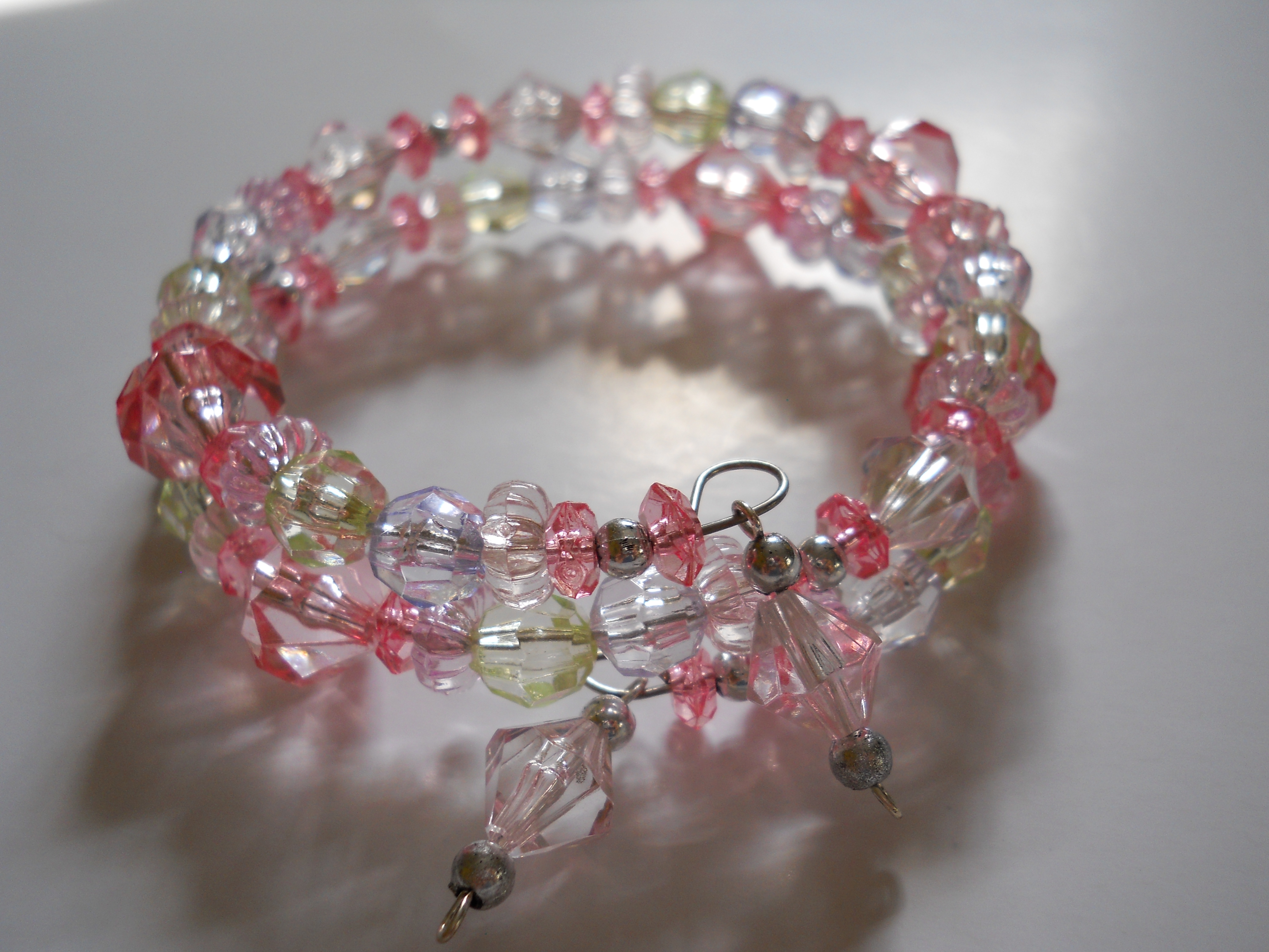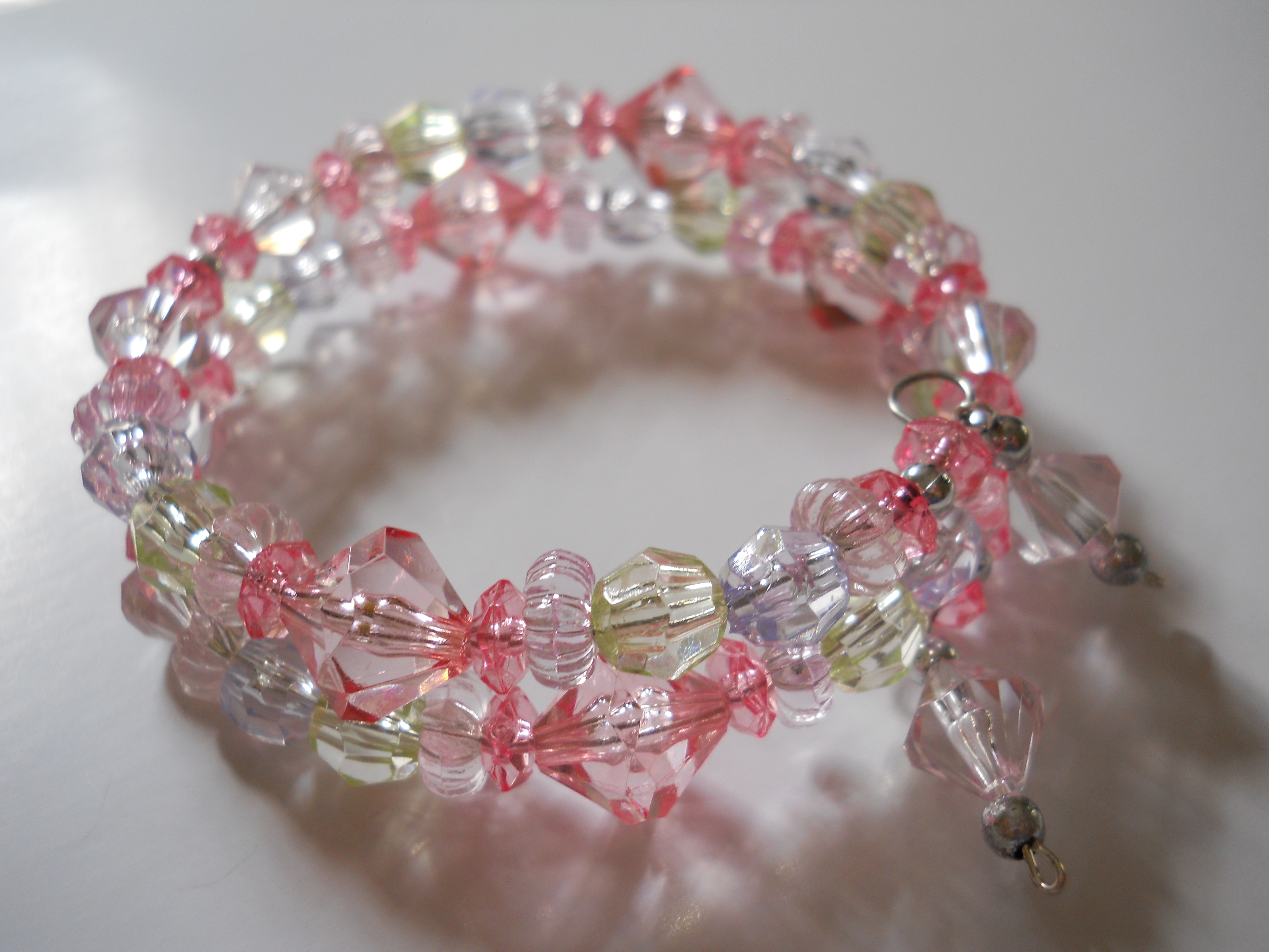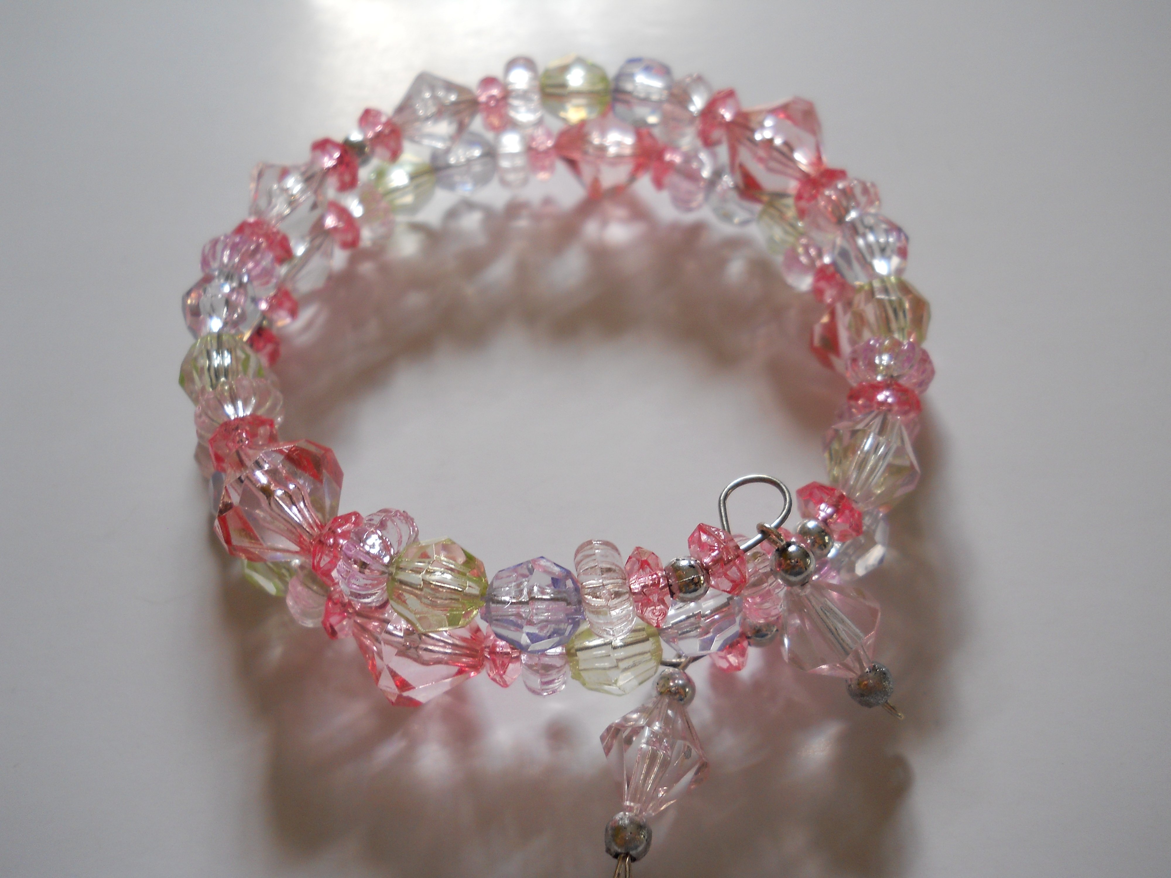 This enchanting bracelet is all handmade, with pink. light purple, light blue and light green acrylic beads, as well as round silver beads!