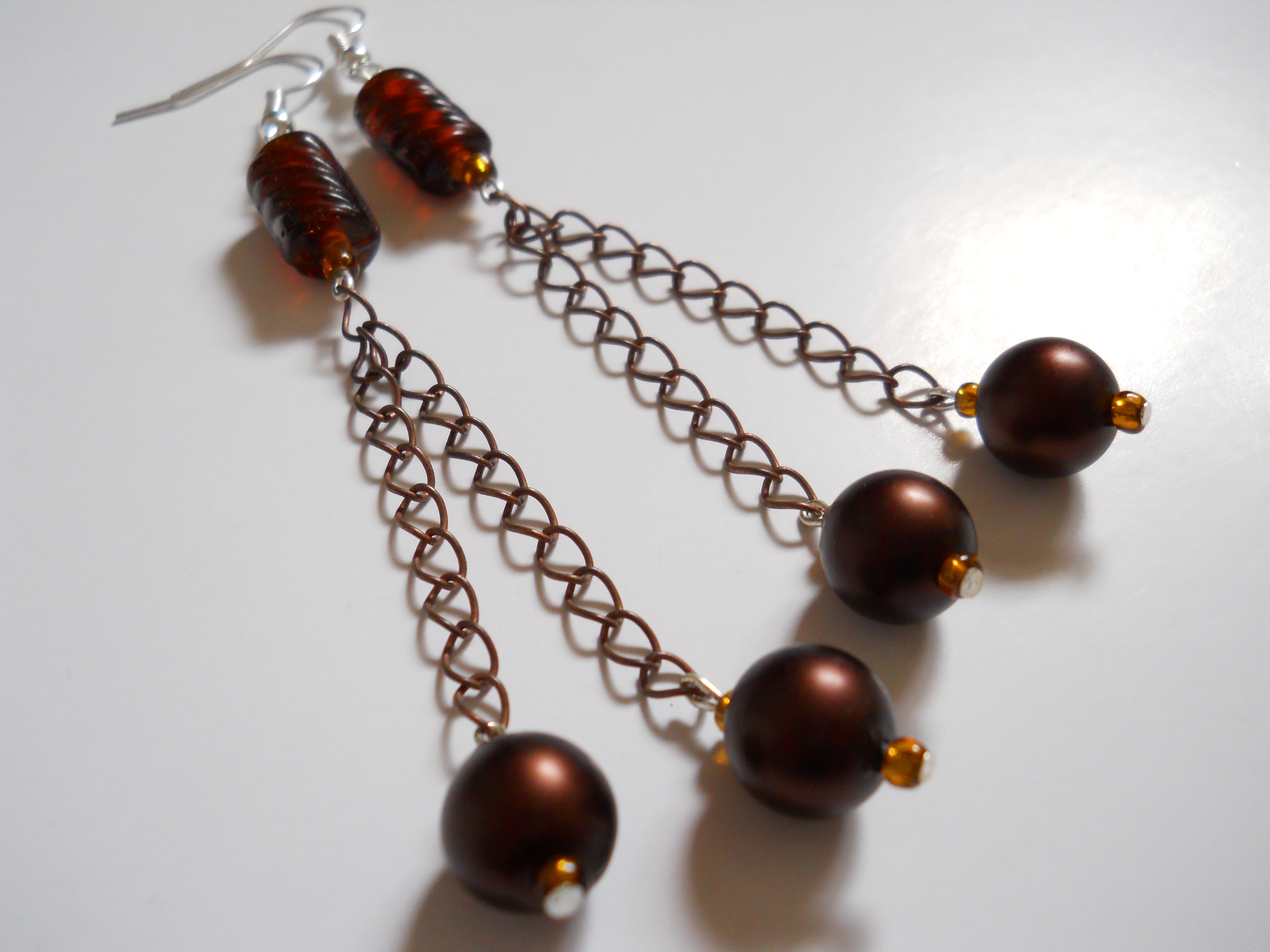 These distinct earrings are sure to make an impression! All handmade with dark brown glass beads, they are linked by a bronze chain with smooth sienna brown beads and yellow/orange seed beads!