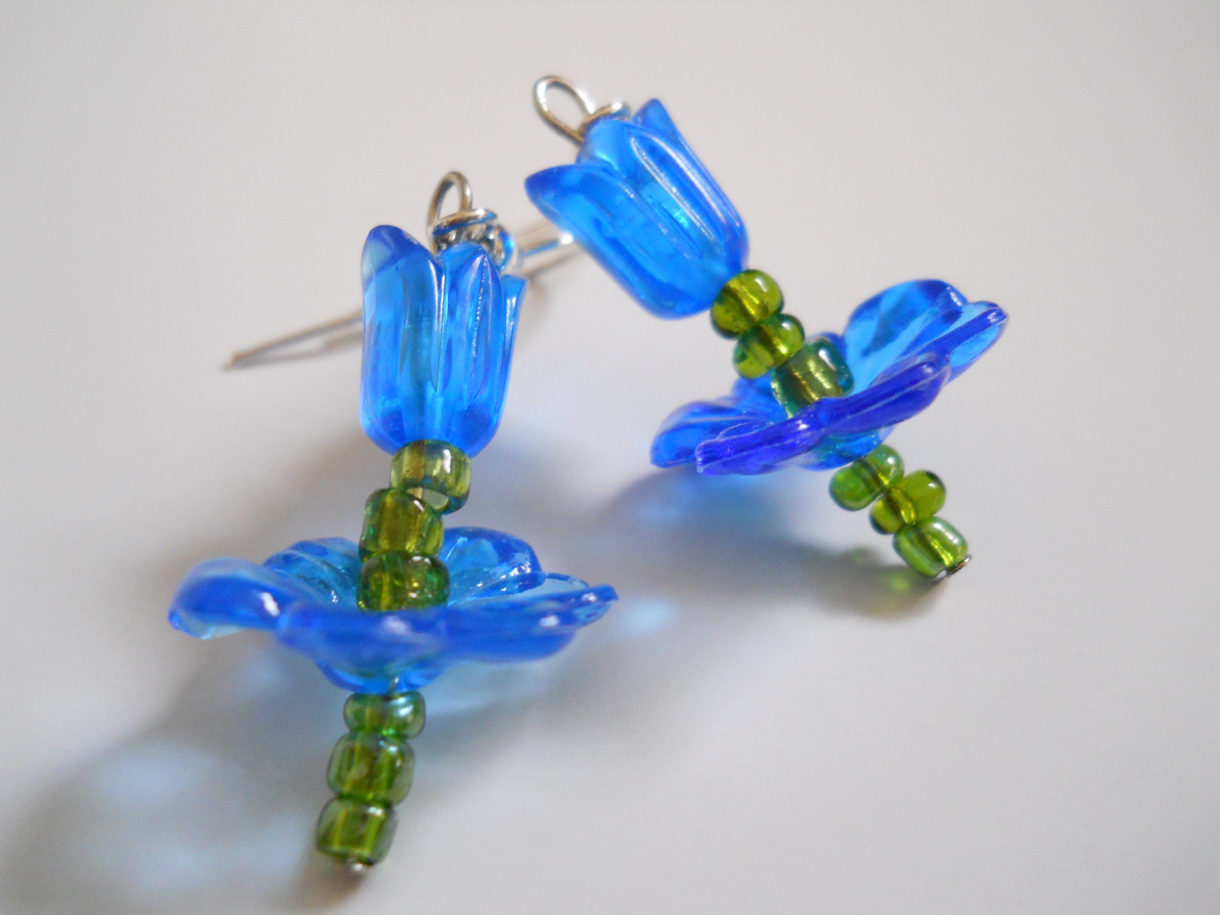 All Handmade with Green Czech Glass E-Beads and Blue Acrylic Beads shaped like Tulip Flowers, these adorably appealing earrings are great for springtime! Connected with fish/french hook wire.