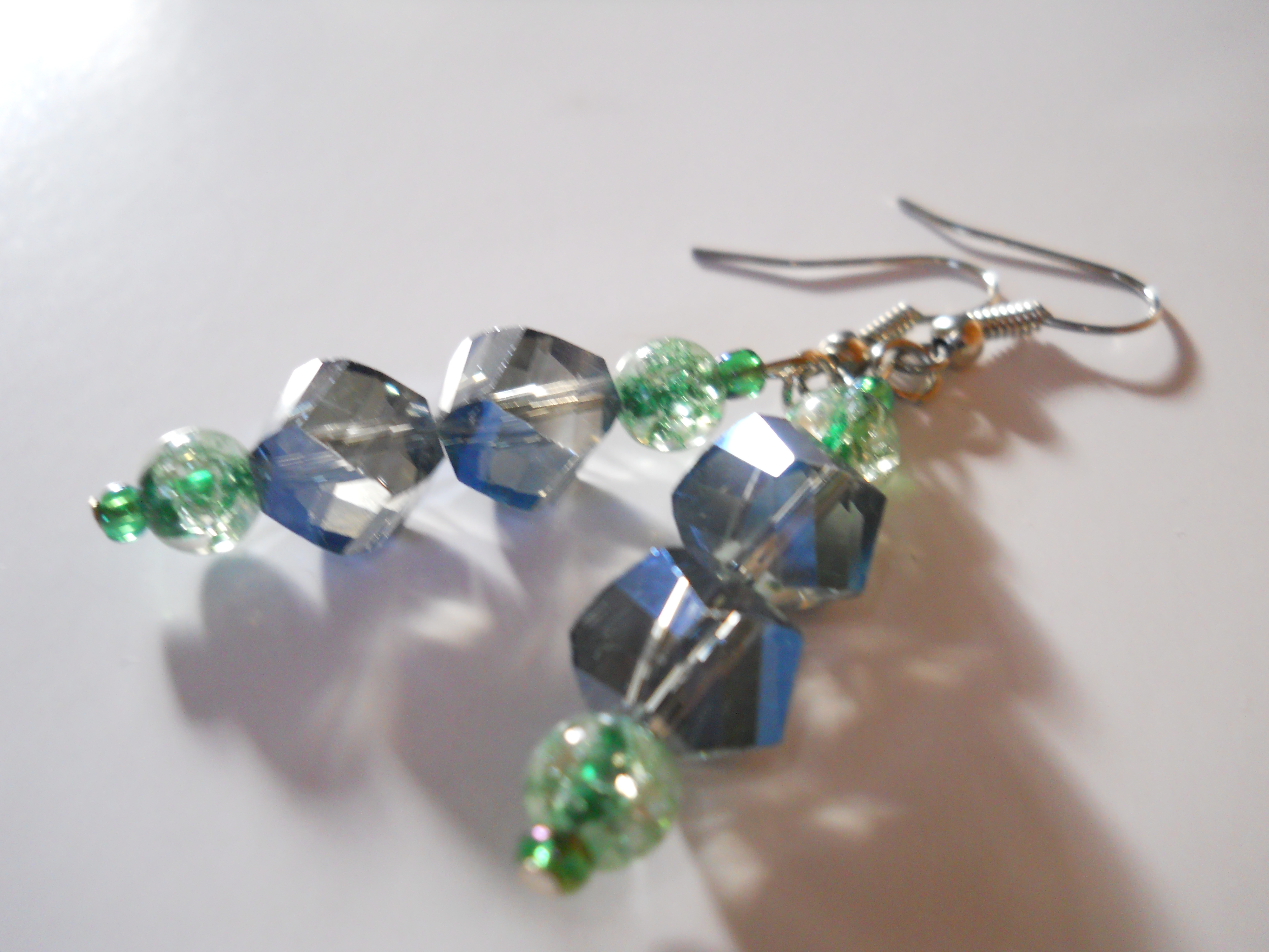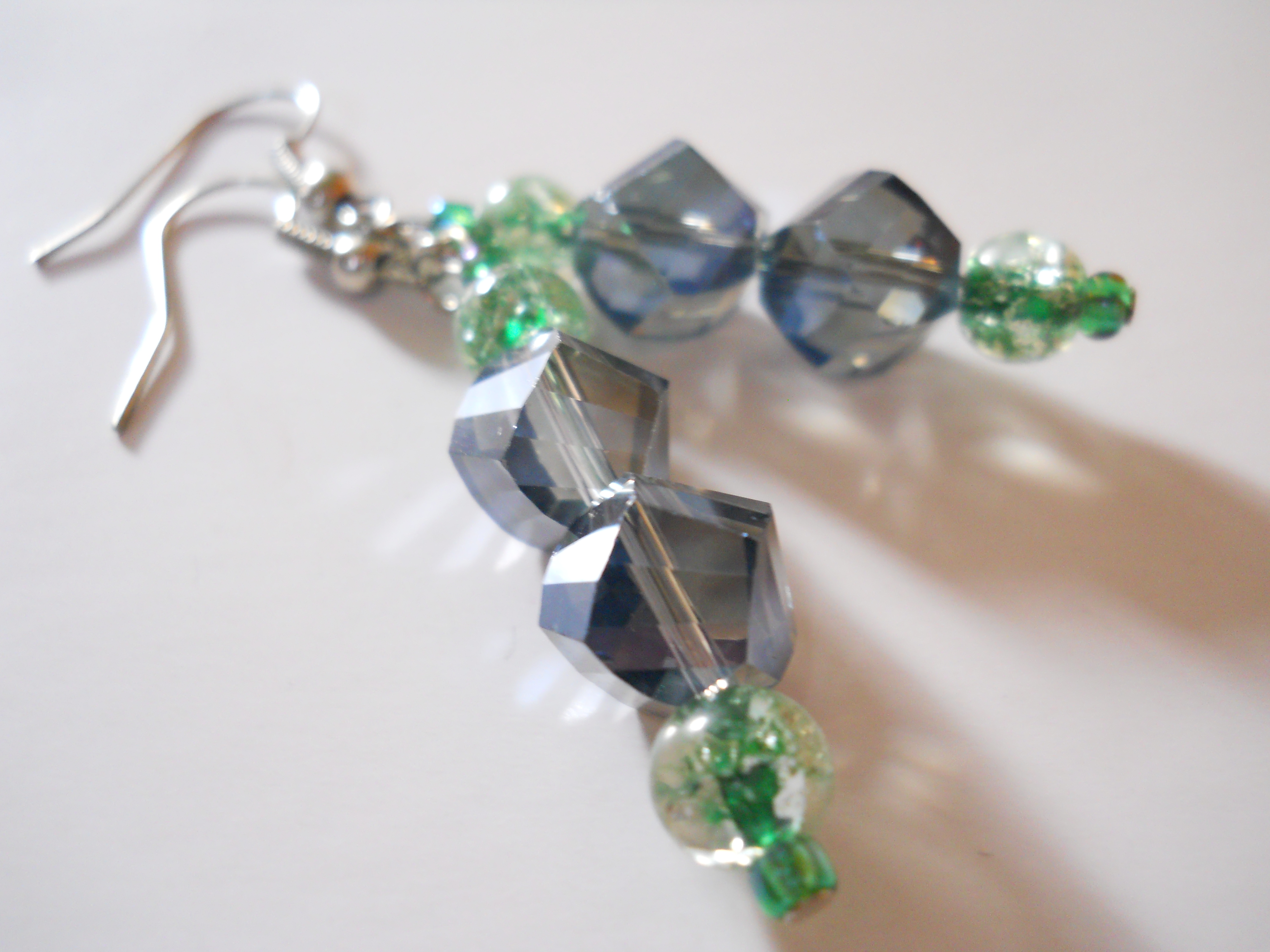 Give your ears that extra sparkle with these Handmade Faceted Blue Glass Beads and Spearmint Green Crackle Glass Bead Earrings! Connected by fish/french hook wire
