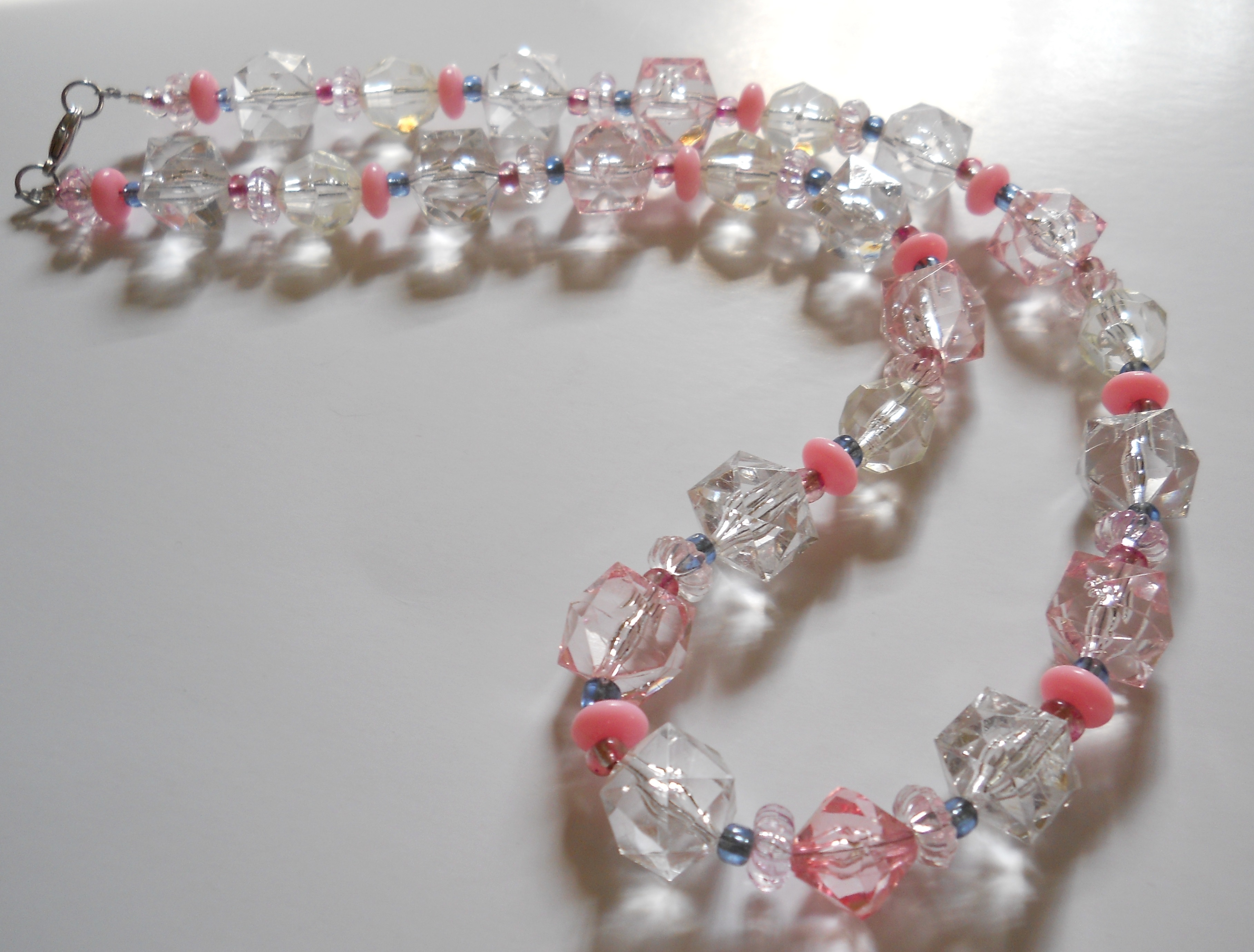 All Handmade, this wonderfully luminous necklace is made of Yellow, Pink and Clear Acrylic Beads as well as Pink and Blue Czech Glass E-Beads!