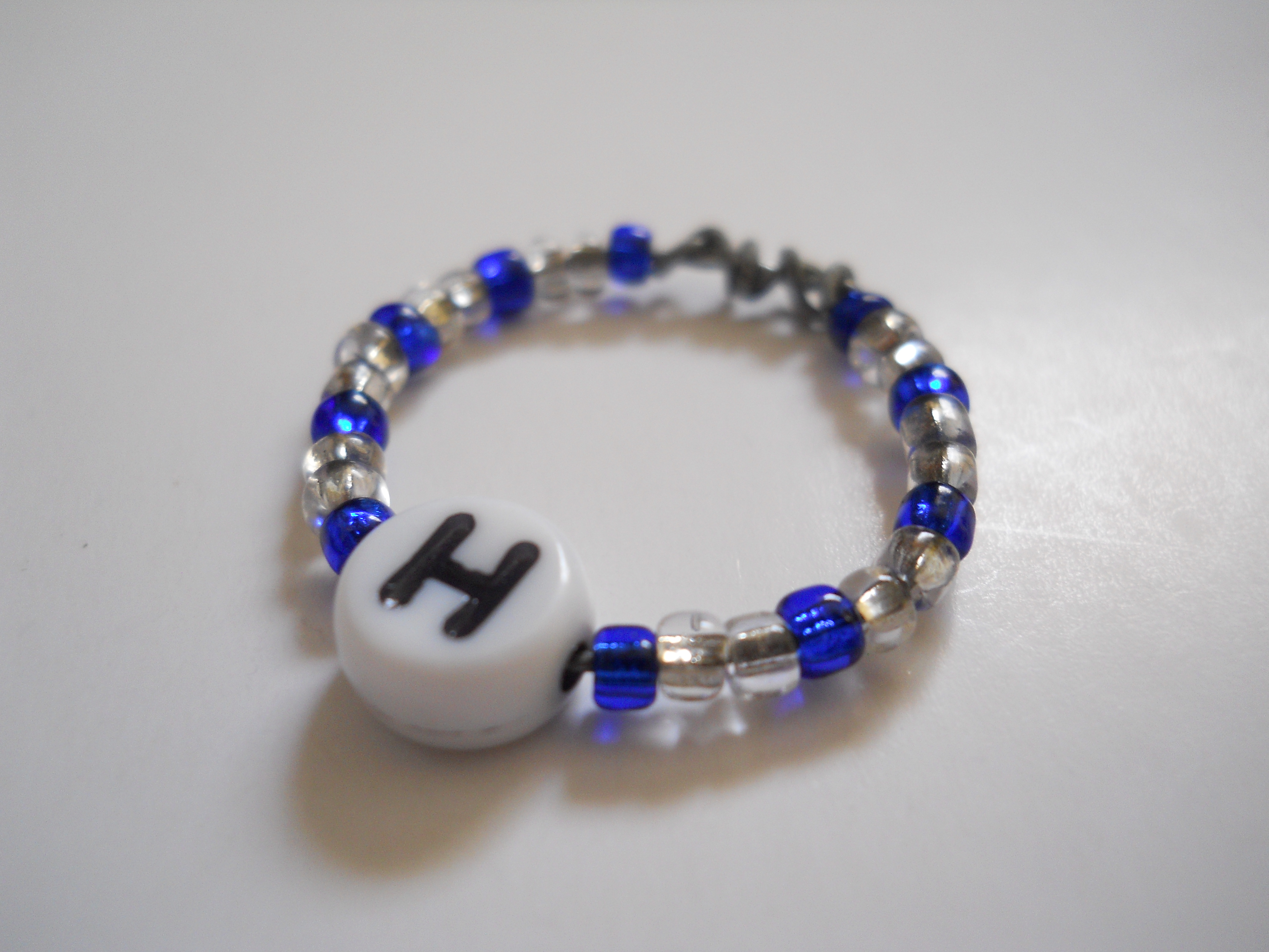 All Handmade with Blue and Silver Seed Glass Beads, centered with Acrylic Letter Bead, made with metal wire