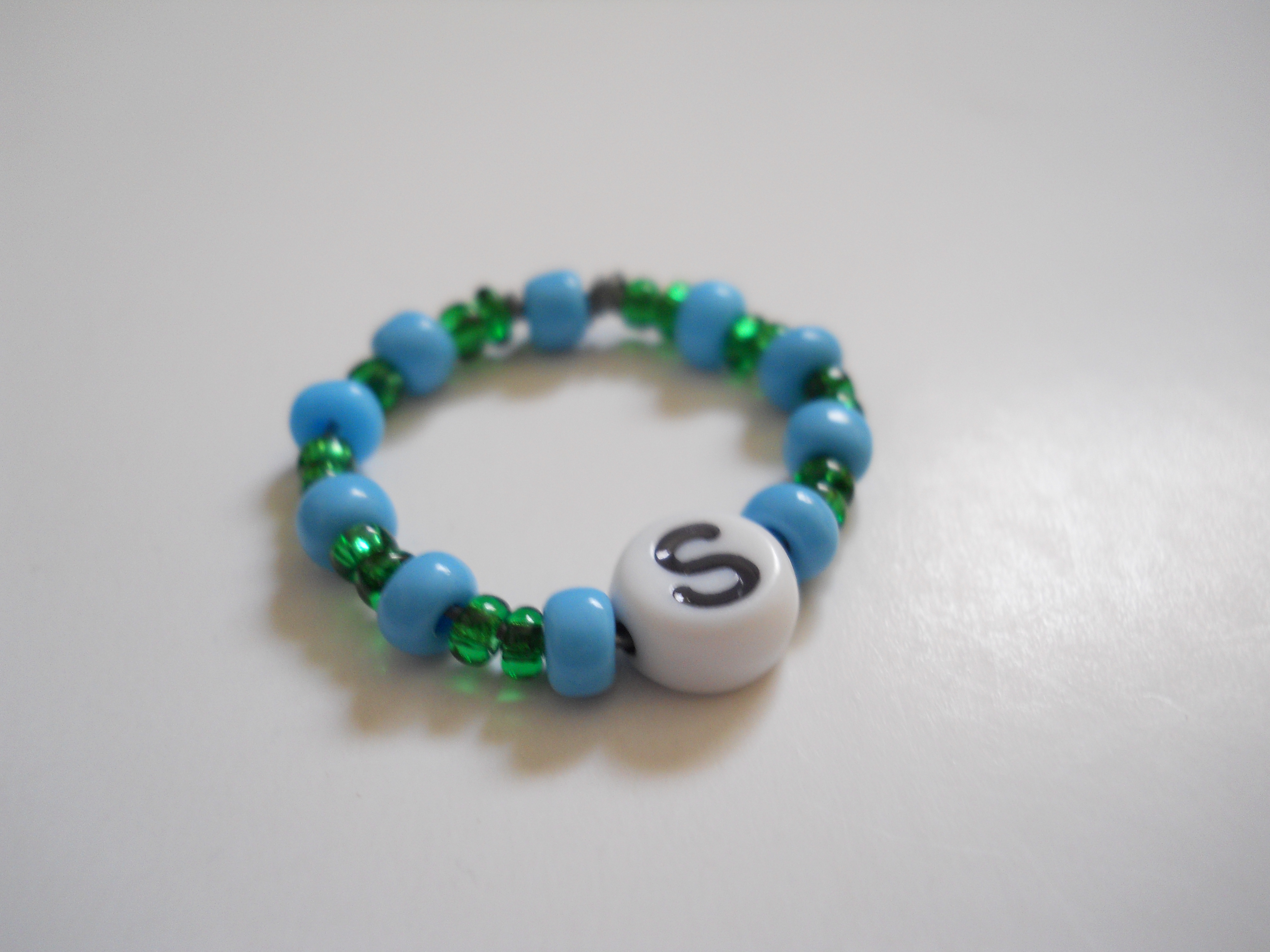 All Handmade with Sky Blue Czech Glass E-Beads and Spearmint Green Seed Glass Beads, centered with an Acrylic Letter Bead. Made with metal wire