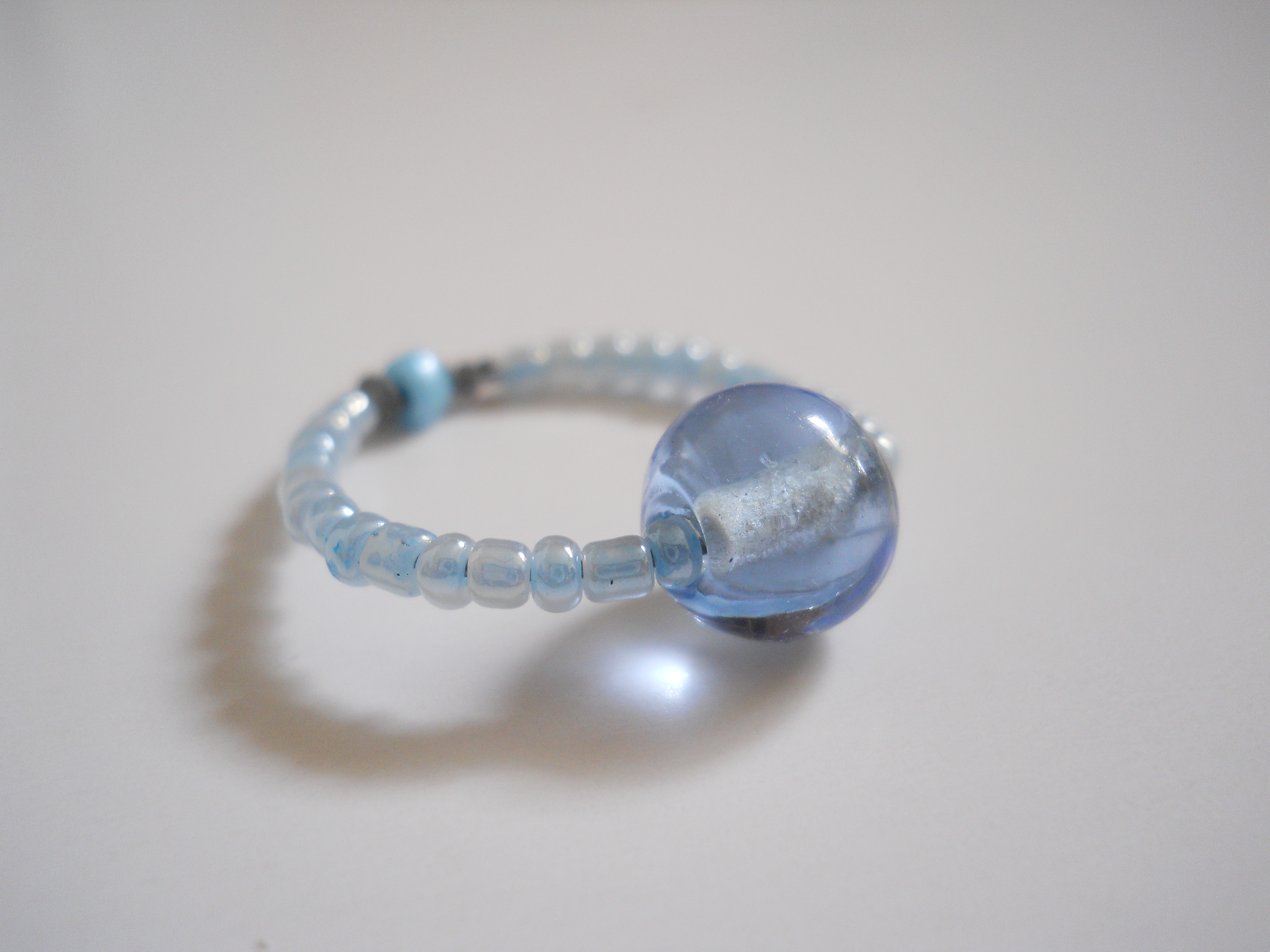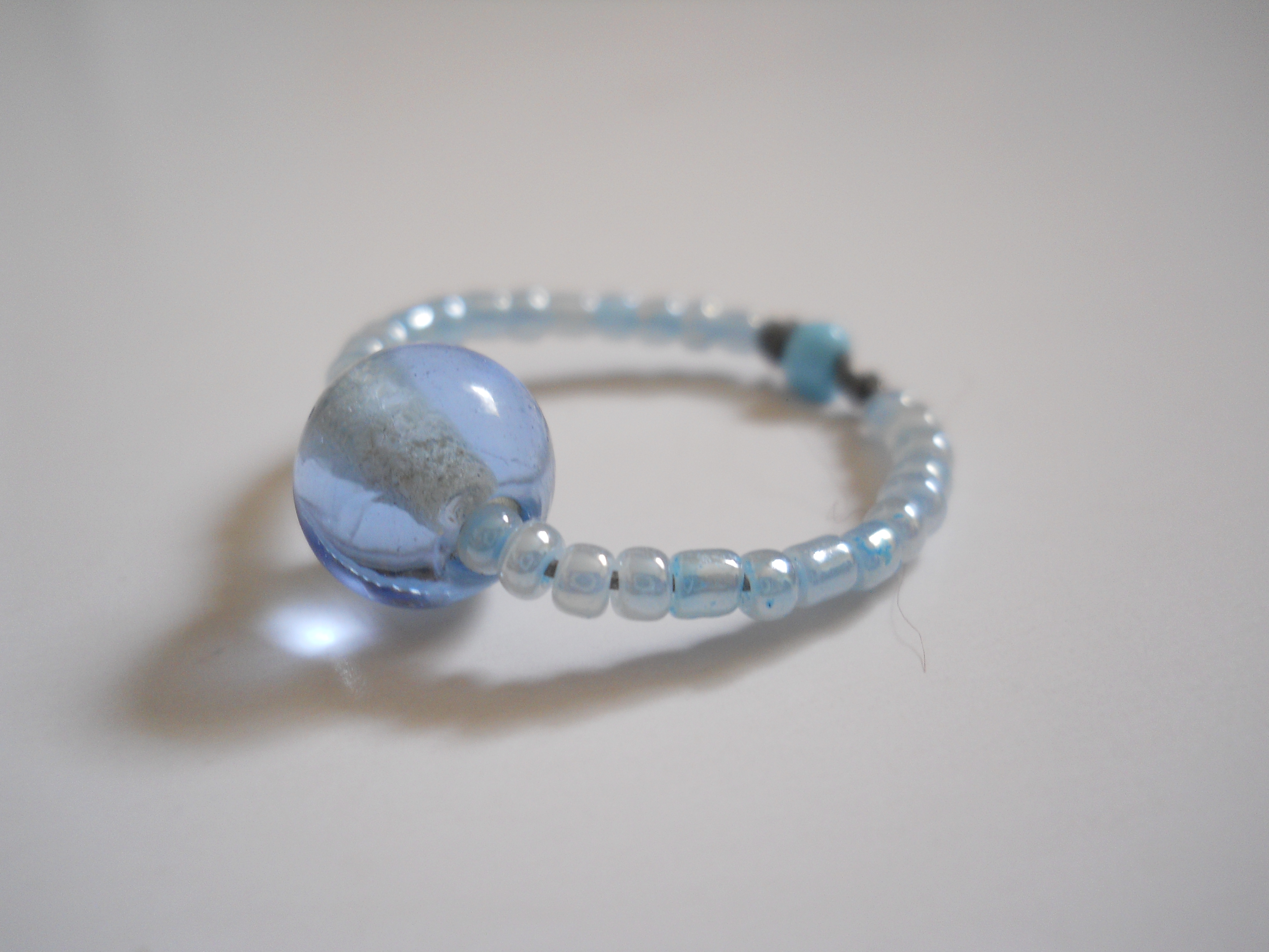 Handmade with Light Blue Seed Beads, it is centered with a Baby Blue Glass Bead, Made with Metal Wire