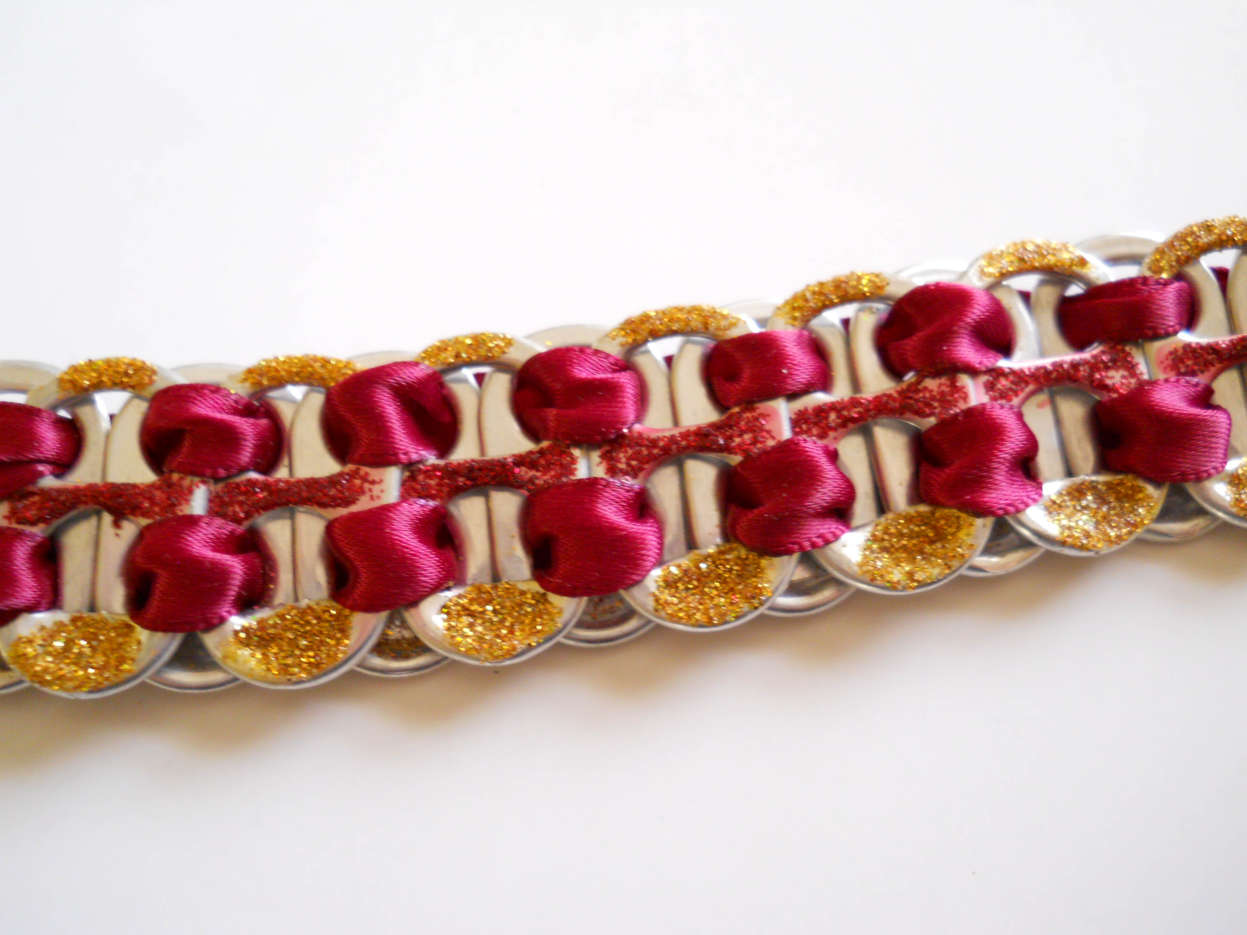 Original, Handmade with Pop Tabs, Ribbon and Glitter Glue. Bracelet is connected by Jump Rings and a Spring Ring Clasp