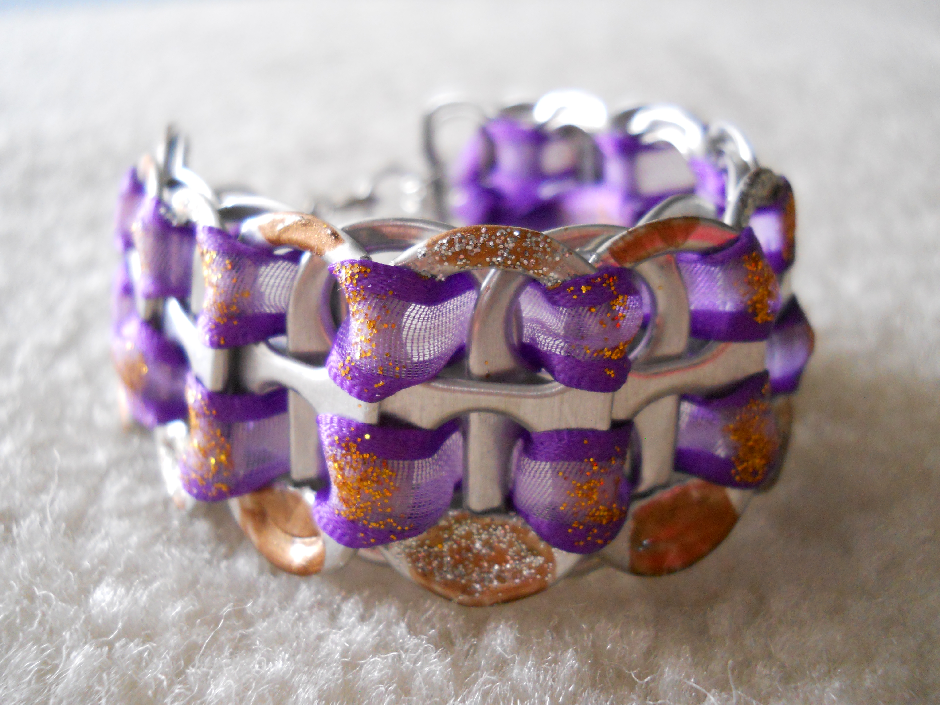 Original, Handmade with Pop Tabs, Ribbon and Glitter Glue. Bracelet is connected by Jump Rings and a Spring Ring Clasp