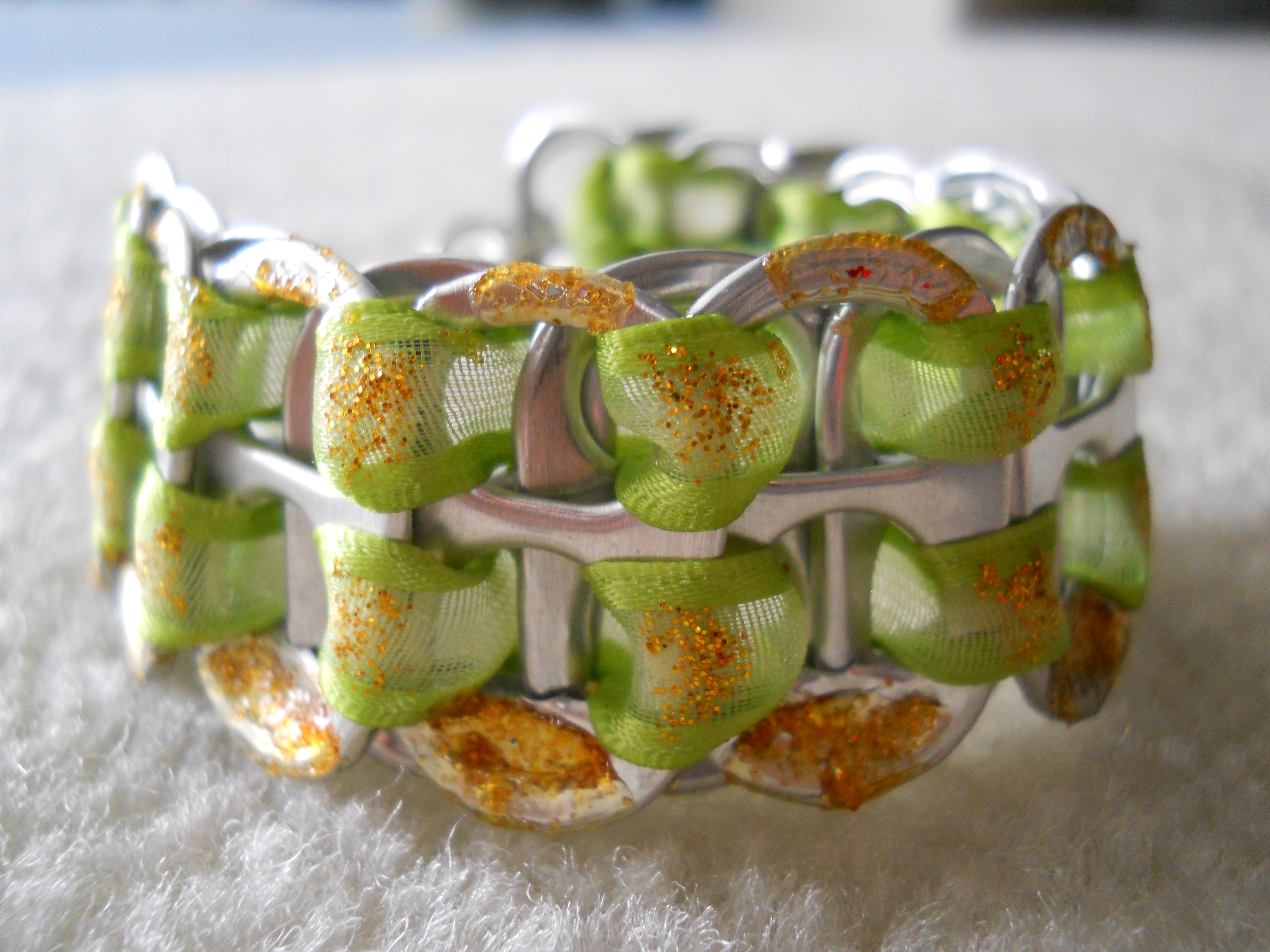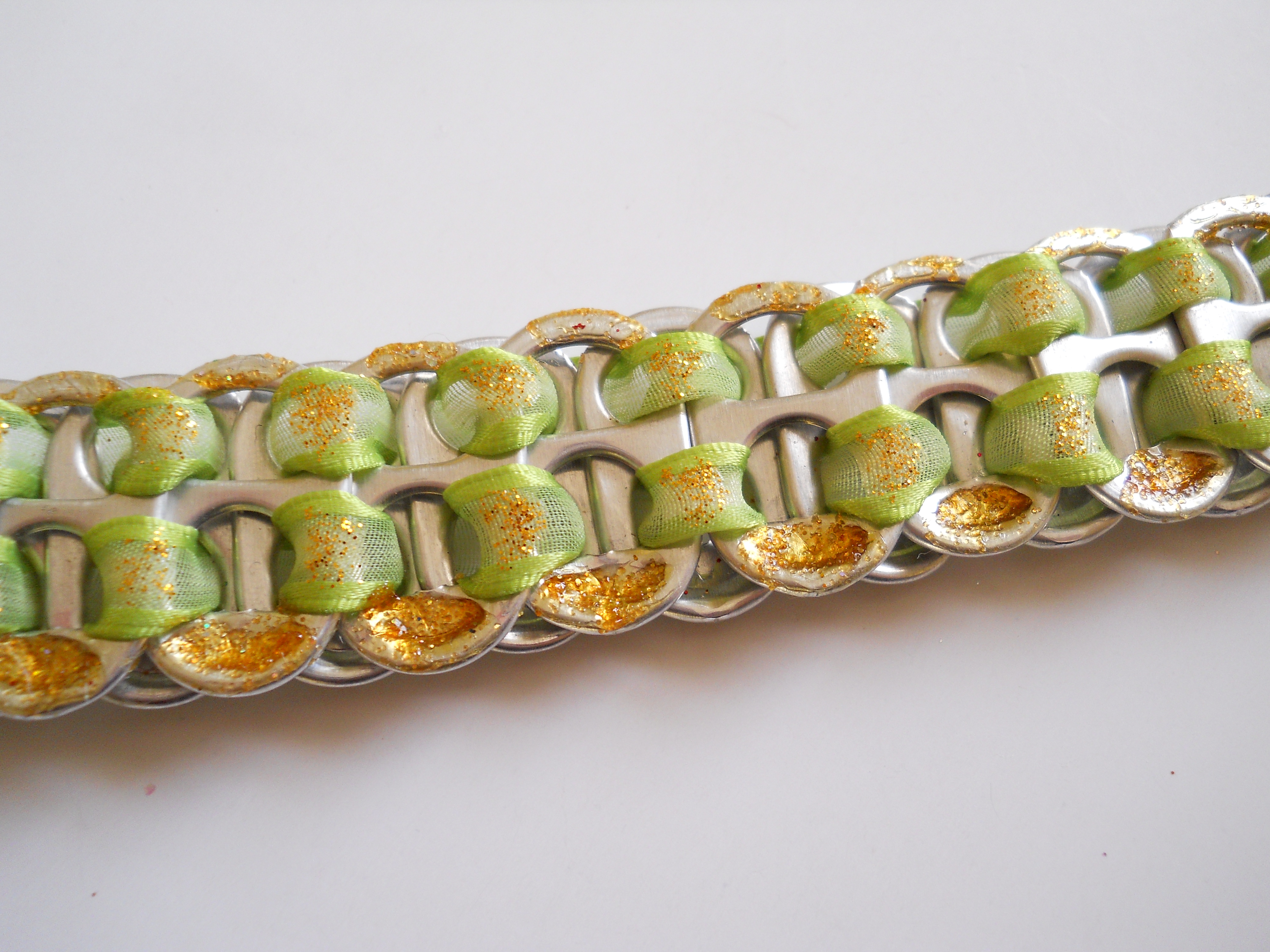 Original, Handmade with Pop Tabs, Ribbon and Glitter Glue. Bracelet is connected by Jump Rings and a Spring Ring Clasp
