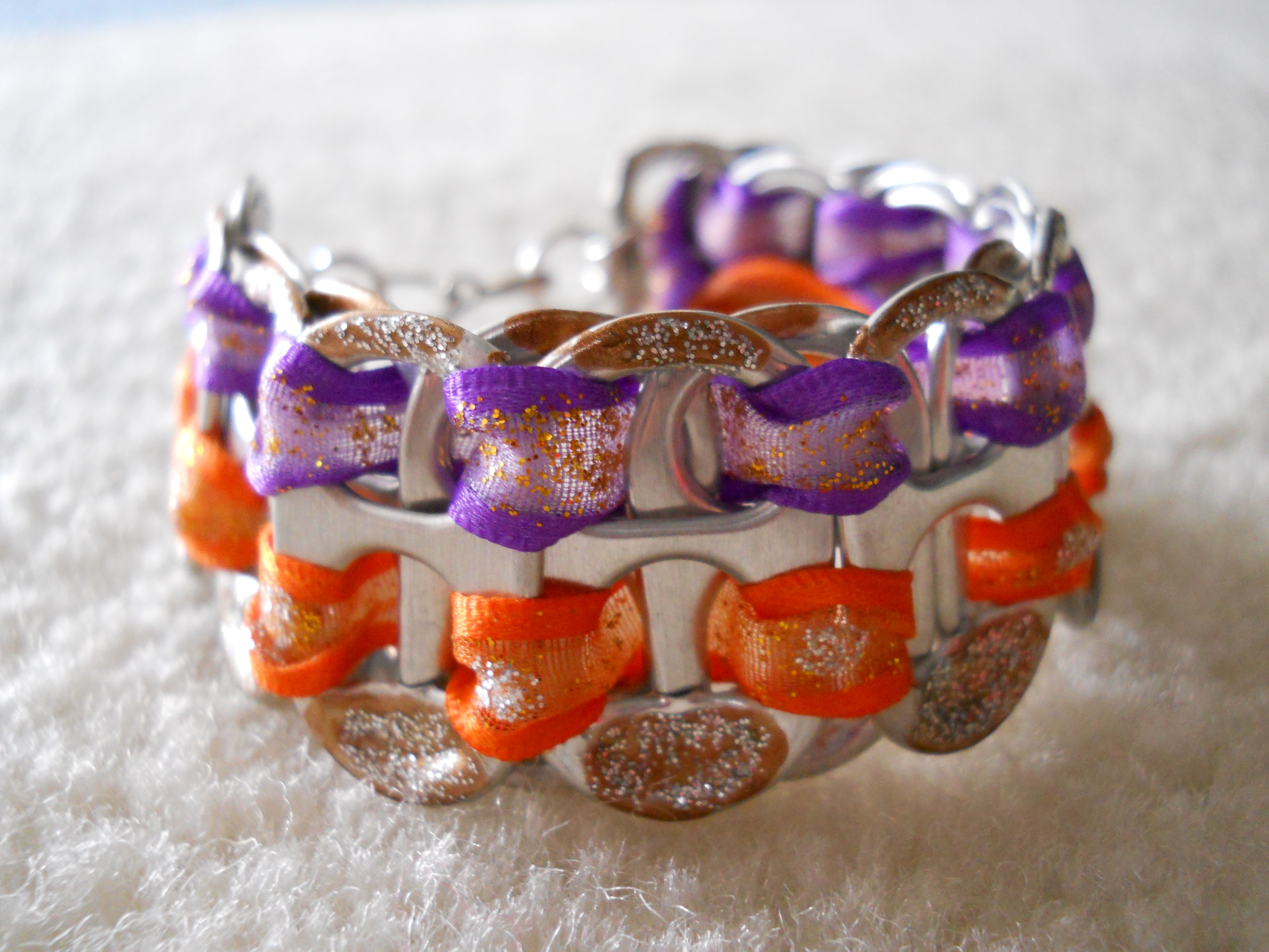 Original, Handmade with Pop Tabs, Ribbon and Glitter Glue. Bracelet is connected by Jump Rings and a Spring Ring Clasp