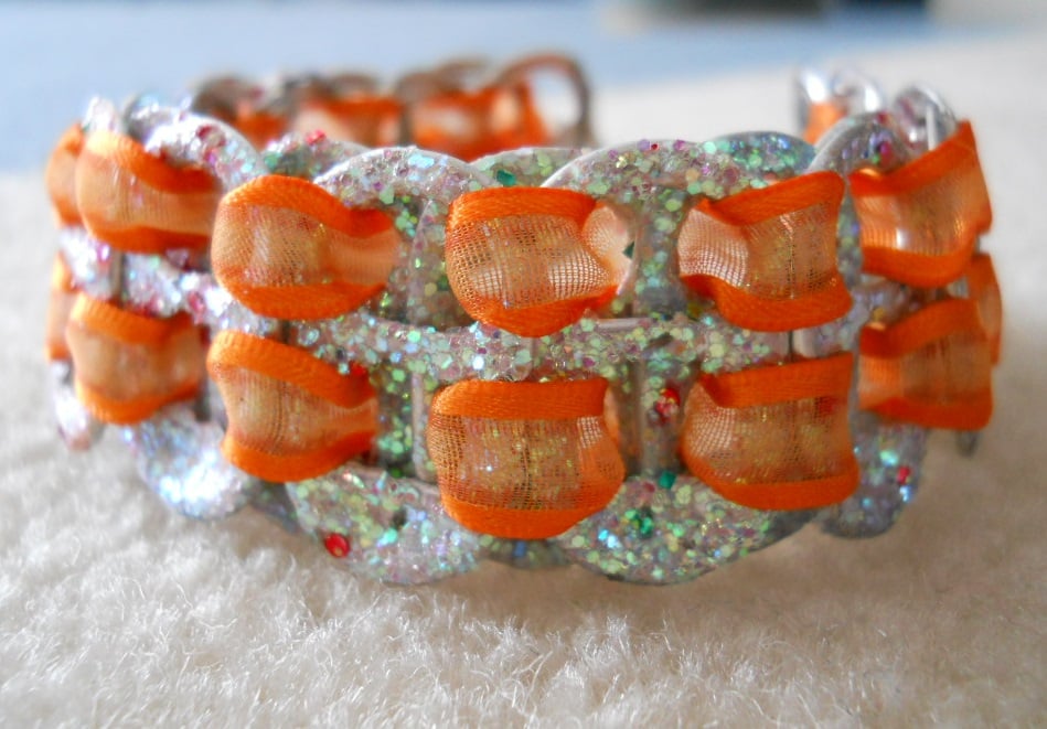 Original, Handmade with Tabs, Ribbon and Glitter Glue. Bracelet is connected by Jump Rings and a Spring Ring Clasp