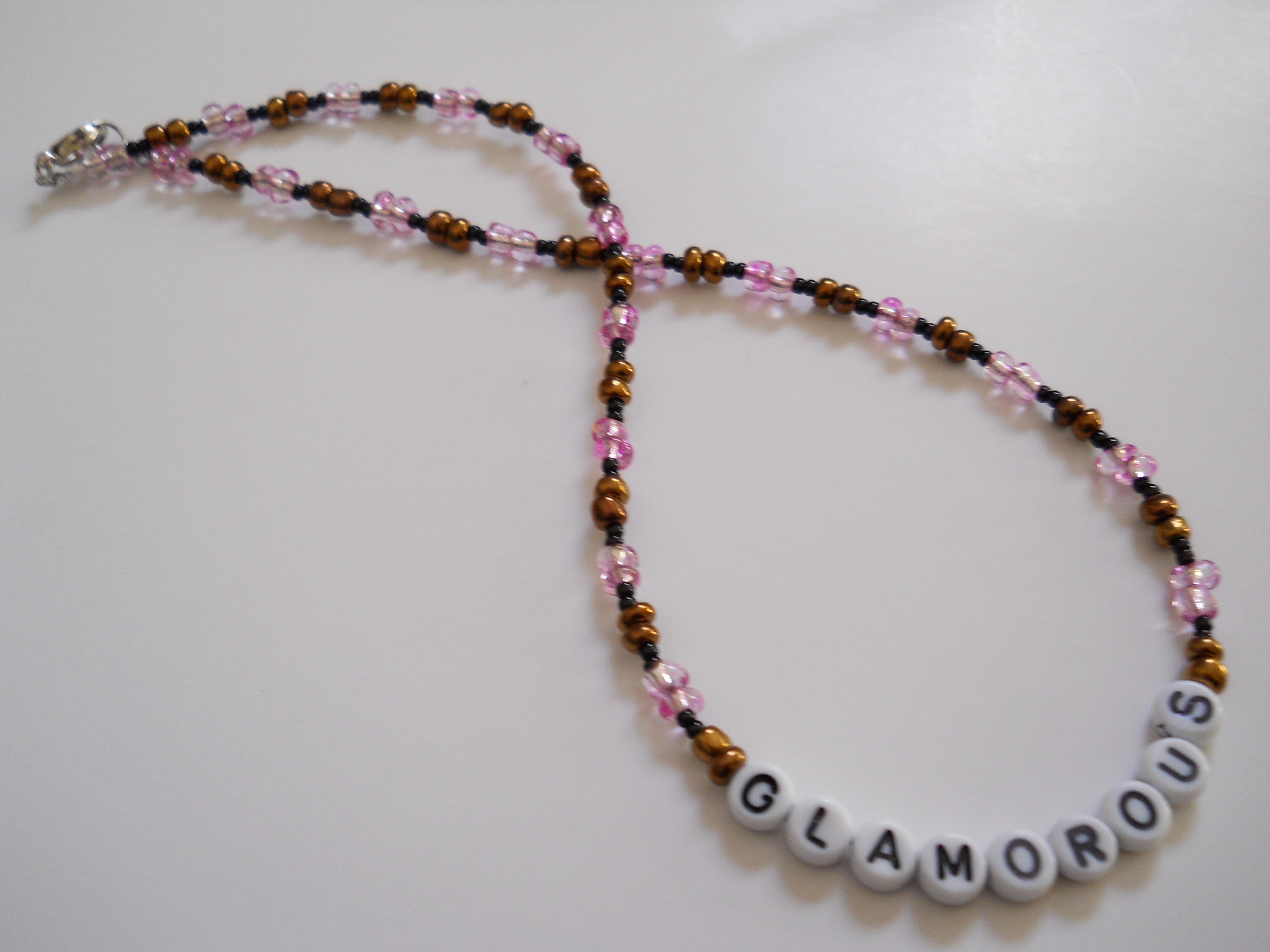Show your glitzy side with this necklace! All handmade with Pink and Gold Czech Glass E-Beads, Black Seed beads, it is centered by Acrylic Letter Beads! Connected by a lobster clasp.