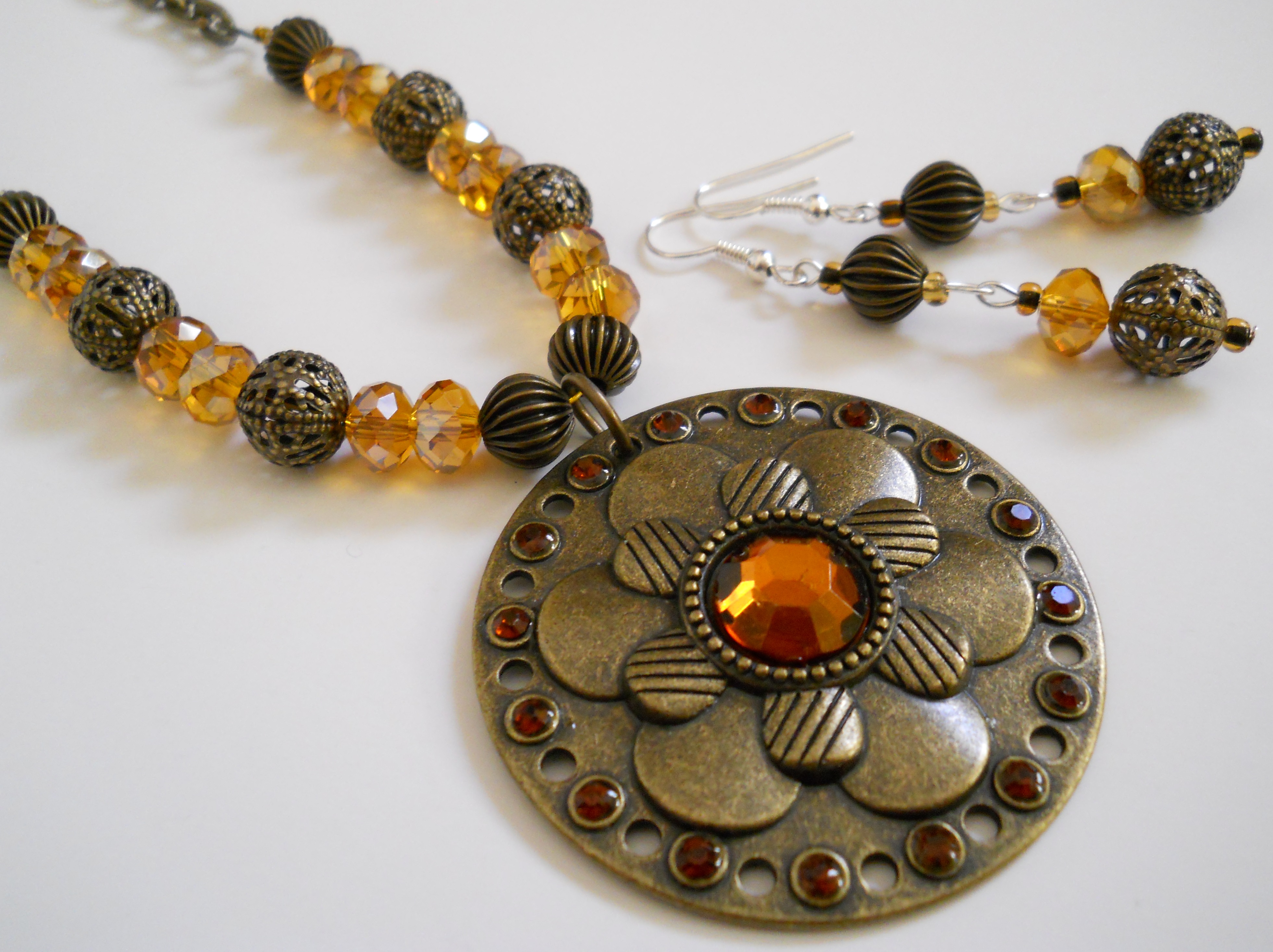 Make your friends do a double take with this spectacular necklace and earrings set! All Handmade with Alluring Amber Crystals, Brass Filigree and Ribbed Beads. The necklace is connected by a long brass-finished chain and centered with a pretty Rhinestone and Crystal Antiqued Brass-Finished Flower Pendant that's sure to turn heads!