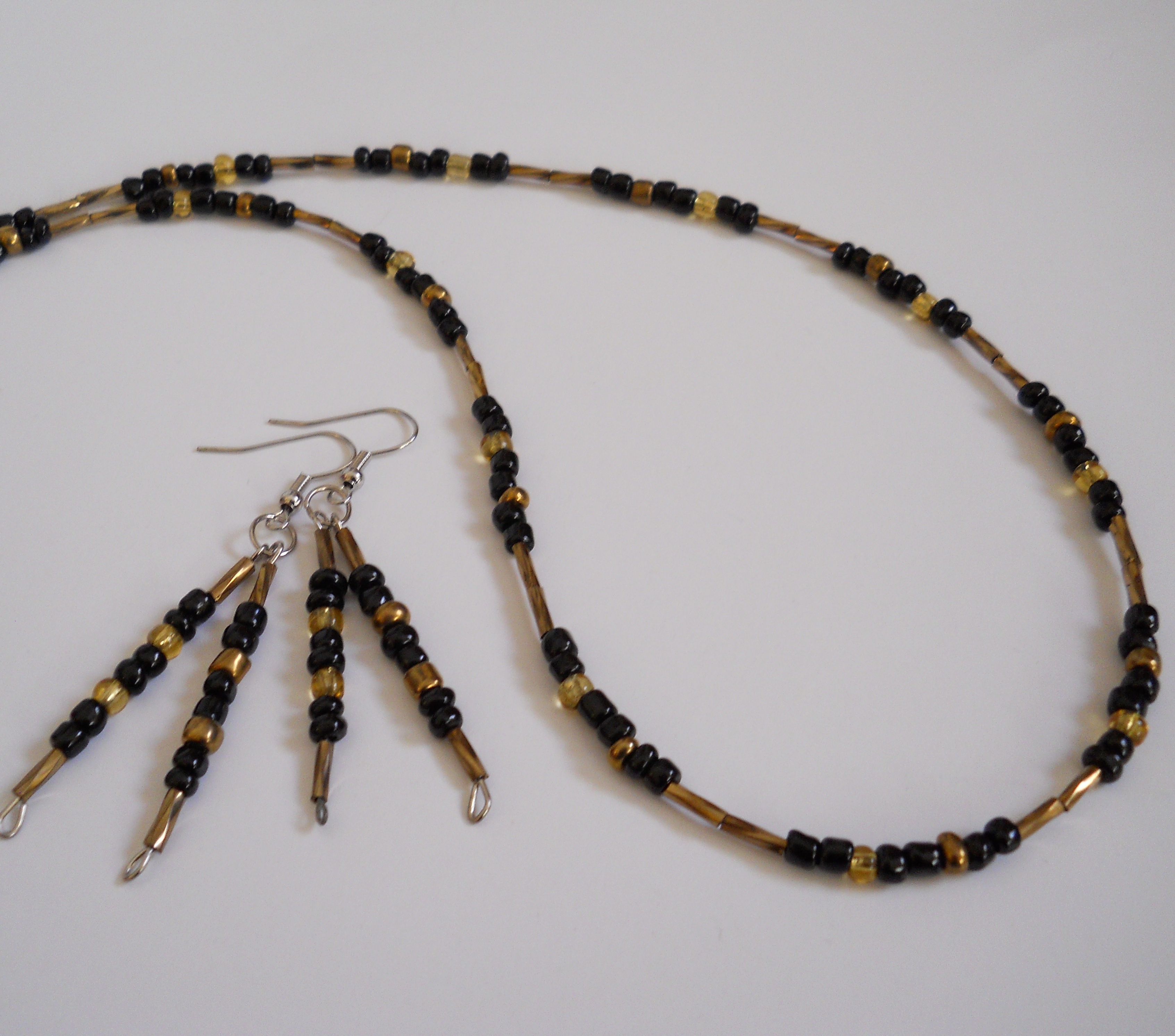 Bold and Sexy, this necklace and earrings set is sure to jazz up an outfit for a party or night on the town! Handmade with Gold-Colored Bugle Beads, Black and Gold-Colored Czech Glass E-Beads, necklace is connected with a spring ring clasp and earrings with fish/french hook wire