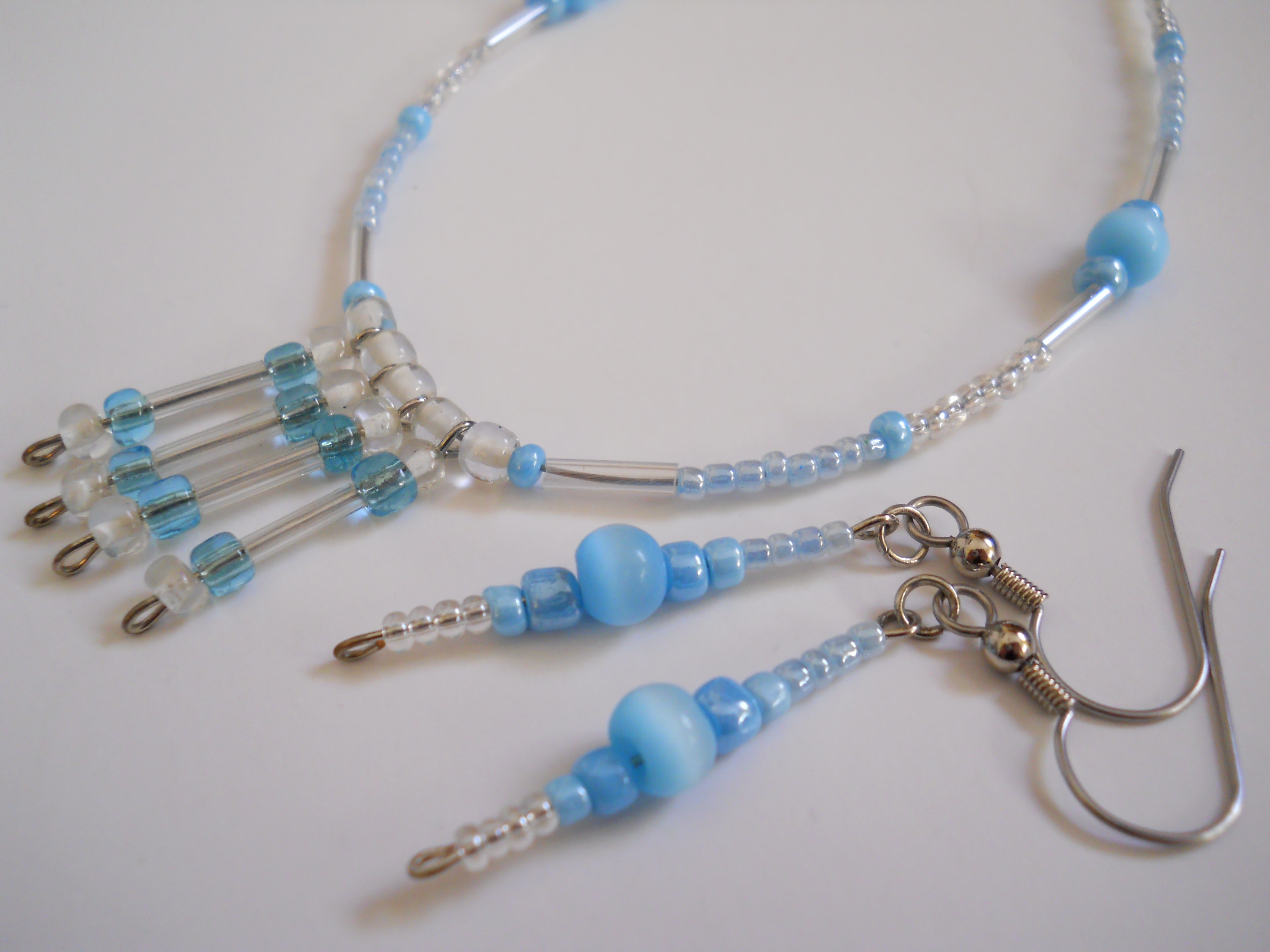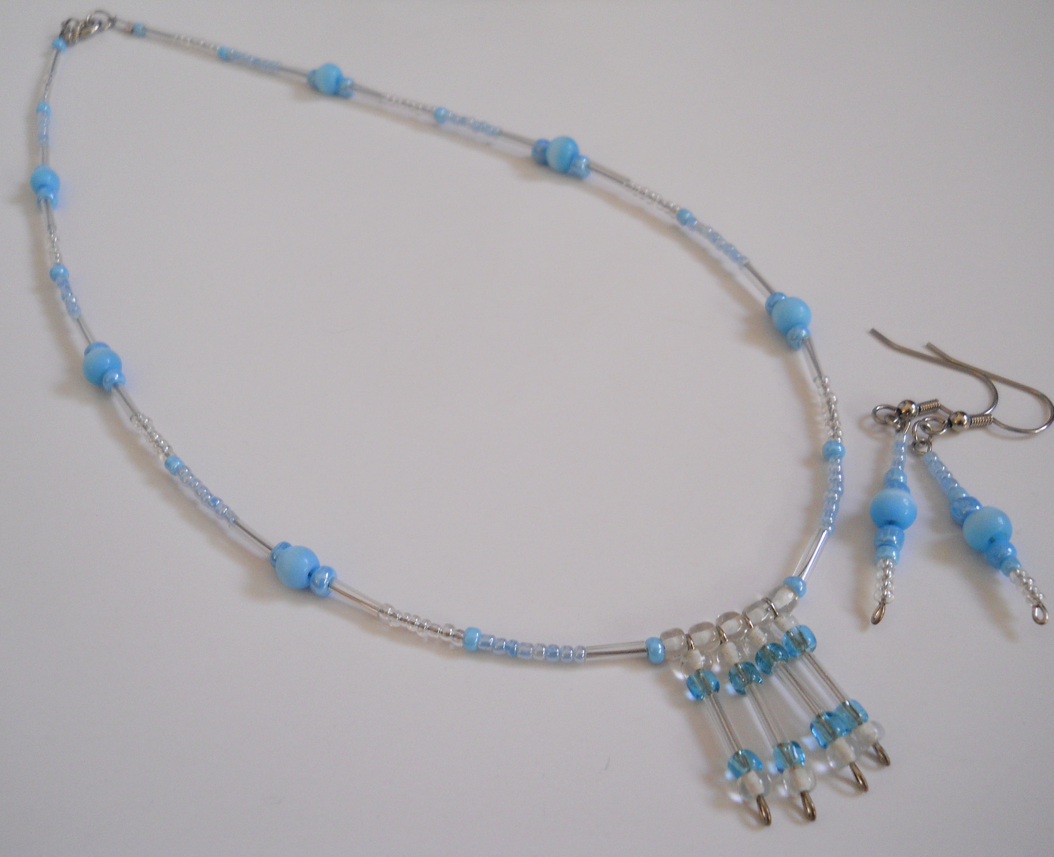 A delicate dreamy blue, this delightful necklace and earrings set is all Handmade with Blue and Clear Seed Beads, the necklace is centered with Blue and Clear Czech Glass E-Beads and Clear Bugle Beads! Necklace is connected by a Spring Ring Clasp. Matching earrings with fish/french hook wire