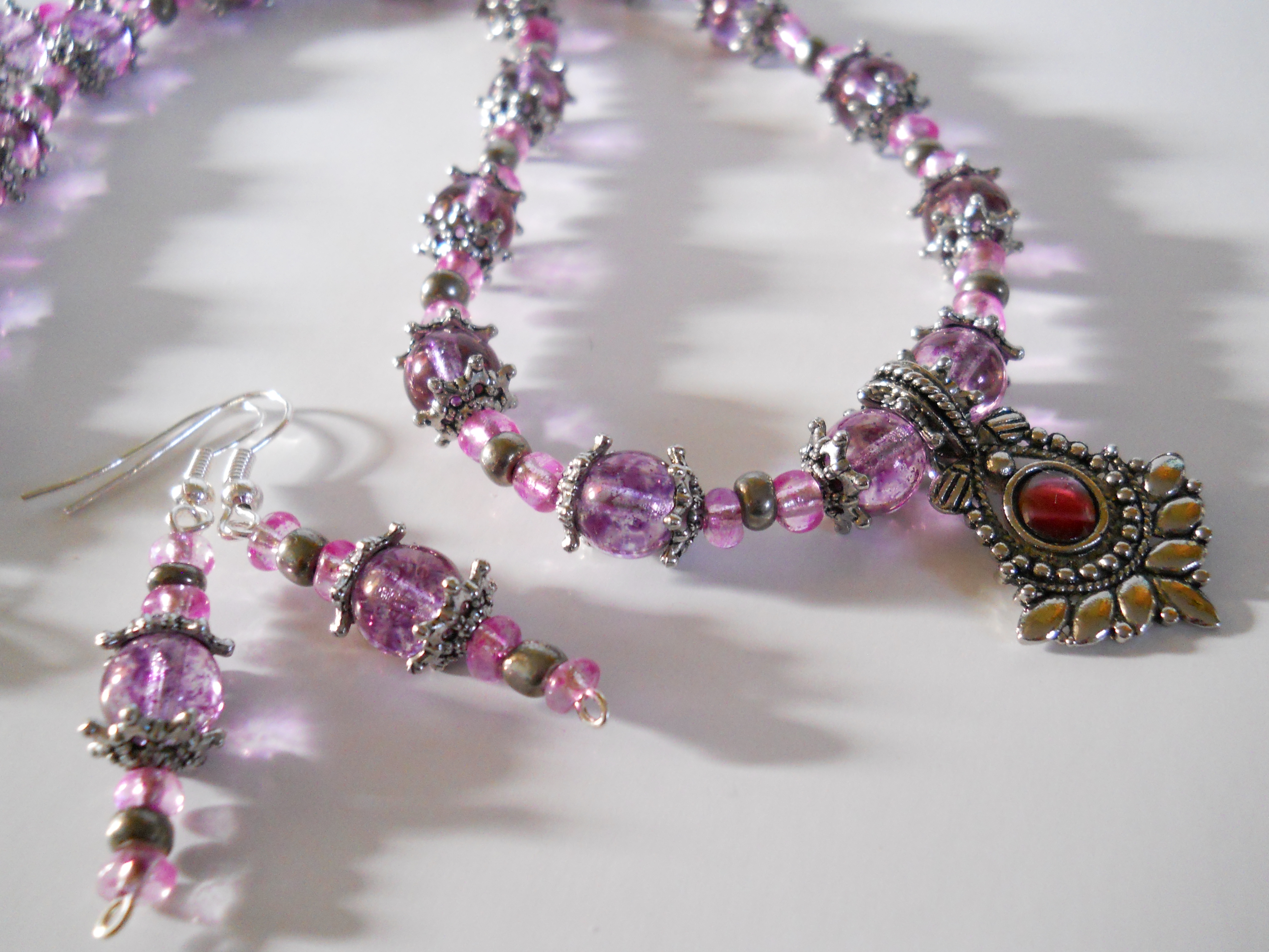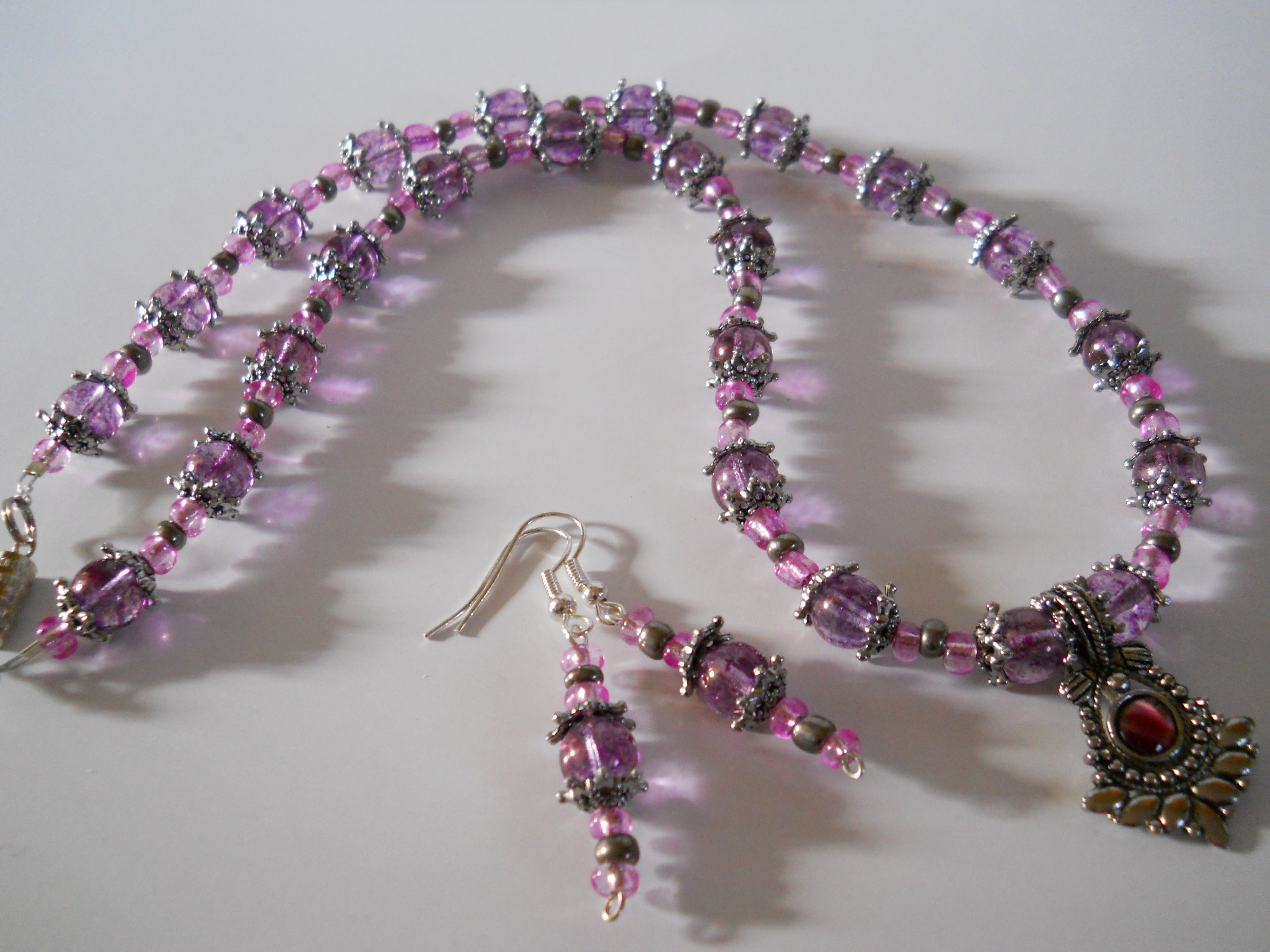 This sophisticated necklace is all handmade with Pink and Silver Czech Glass E-Beads, luxurious Amethyst Glass Beads, surrounded by pretty Metal Cap Beads and centered with an eye-catching Metal Pendant! Connected by a Barrel Clasp. Matching earrings connected with fish/french hook wire