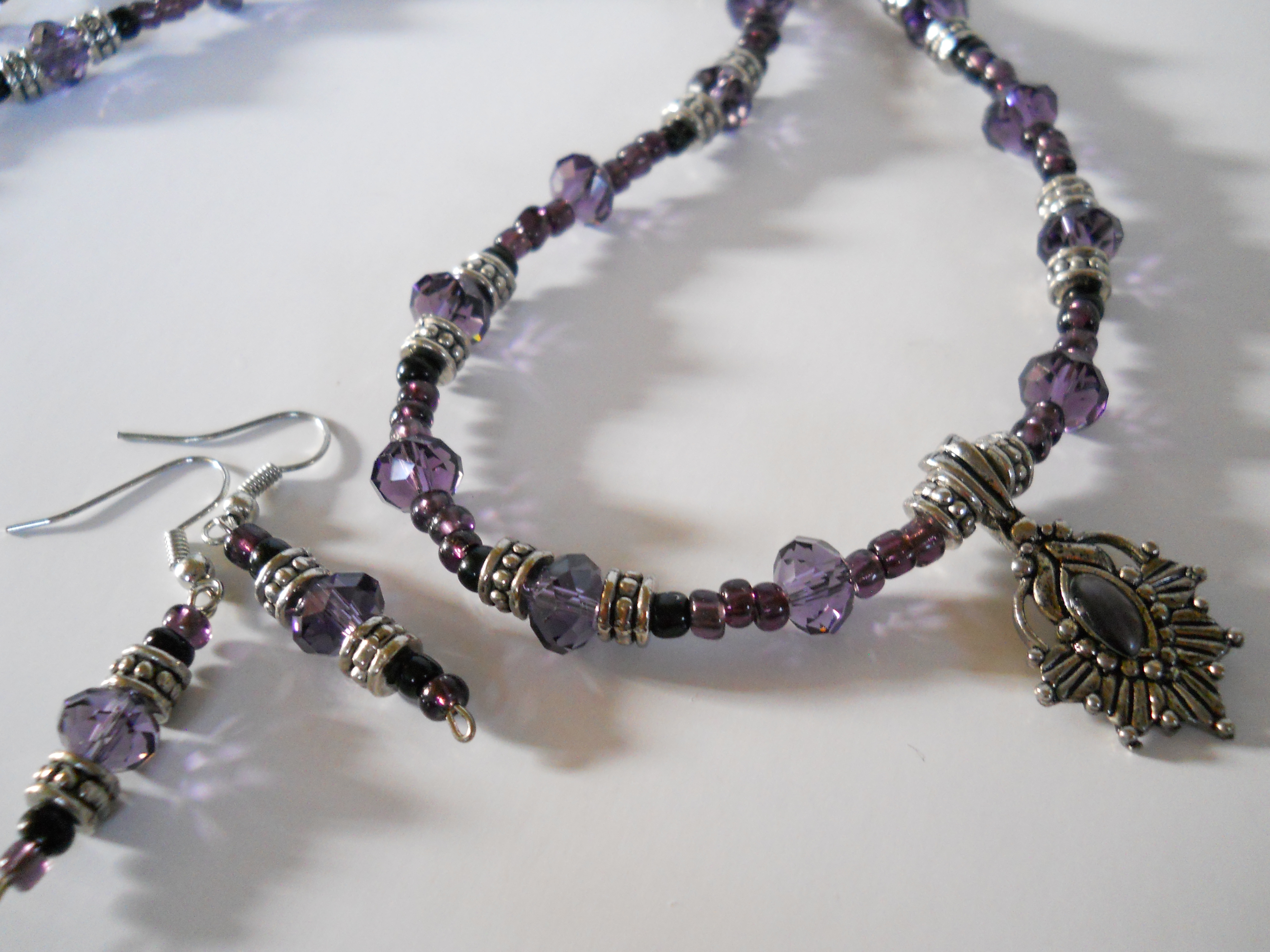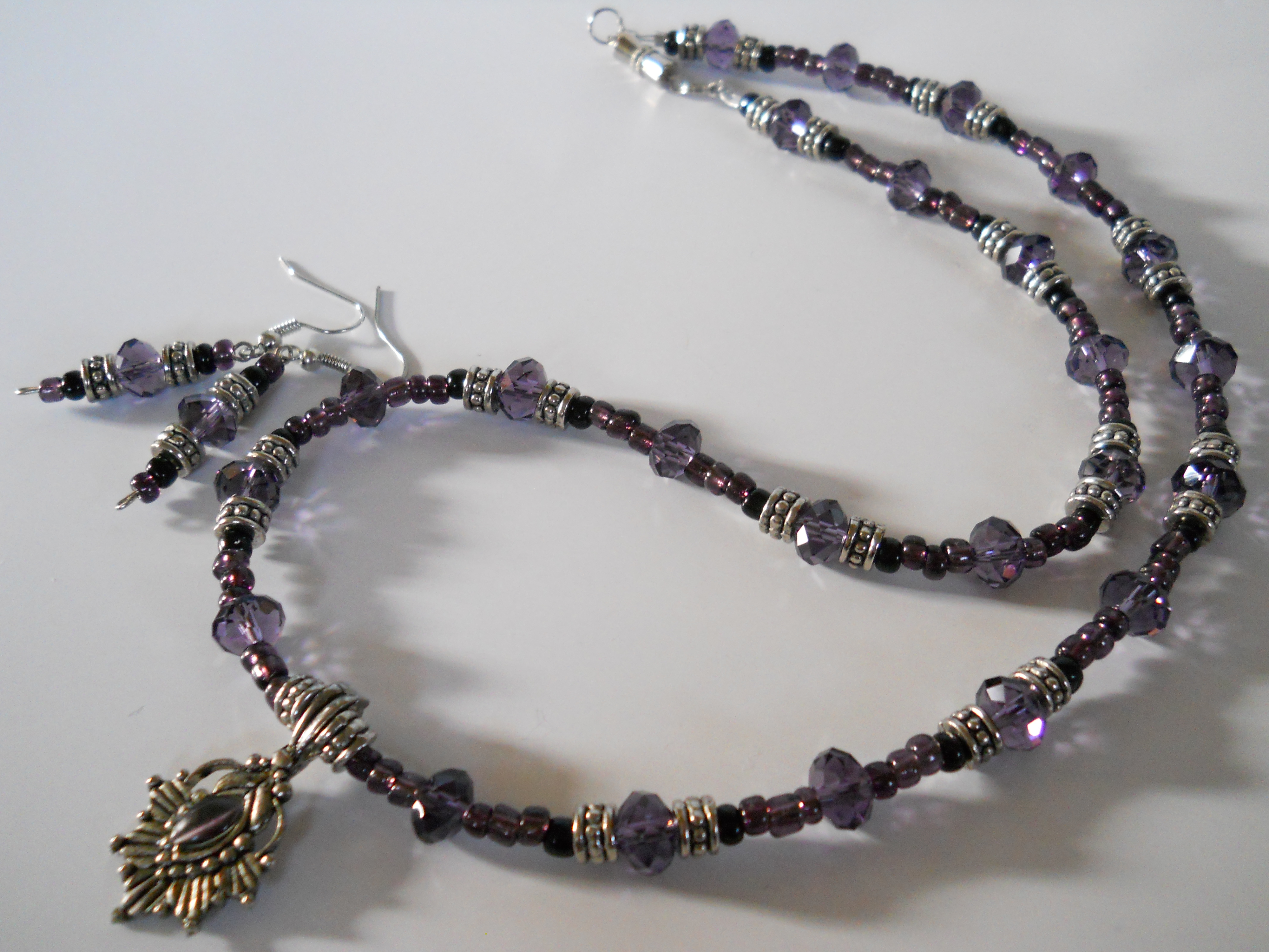 This extraordinary necklace and earrings set is all handmade with shimmering Purple Crystal Rondelle Beads, Black and Purple Czech Glass E-Beads and Metal Beads! Centered with a uniquely attractive Metal Pendant, necklace is connected by a Barrel Clasp, and matching earrings with fish/french hook wire