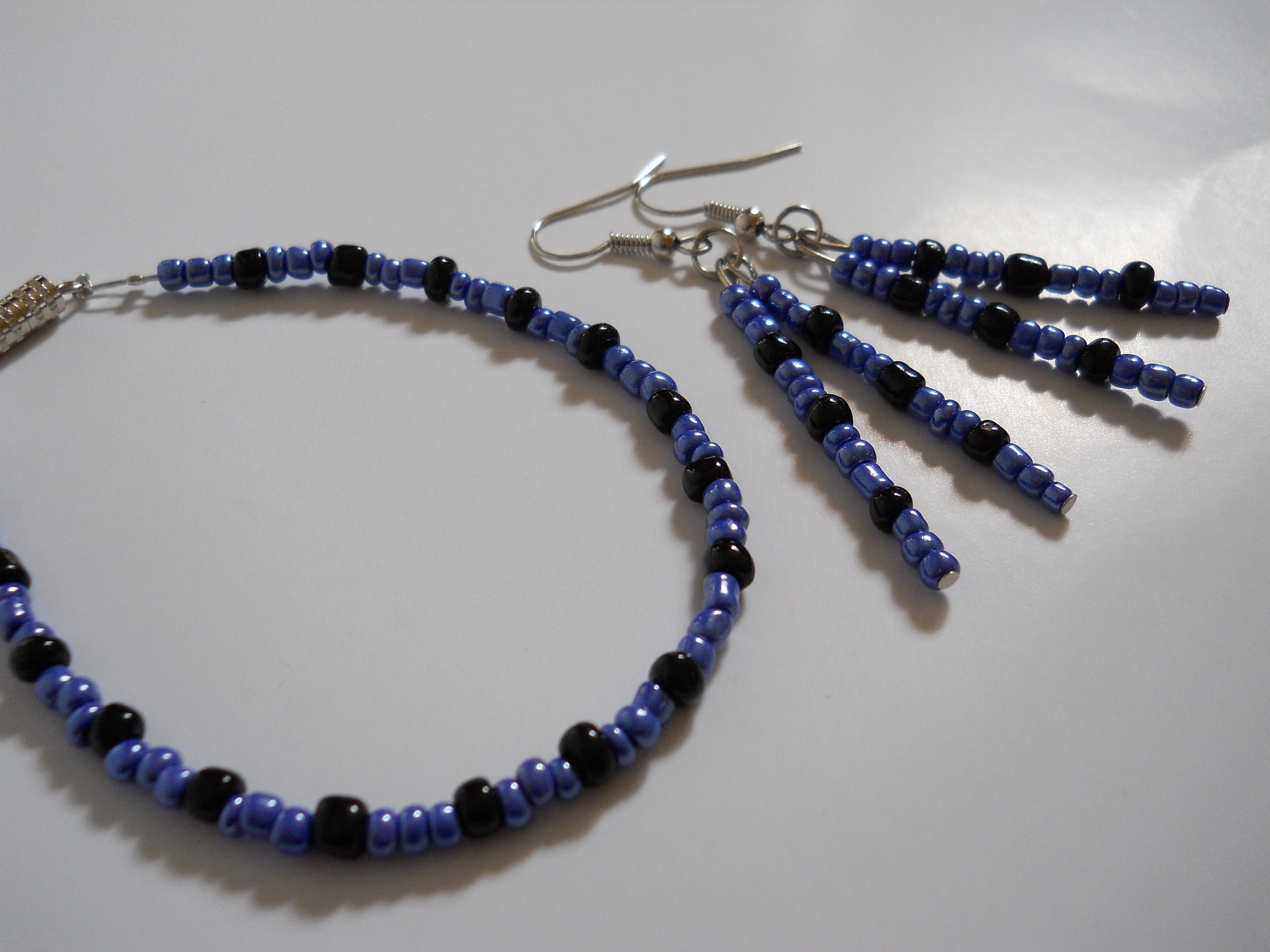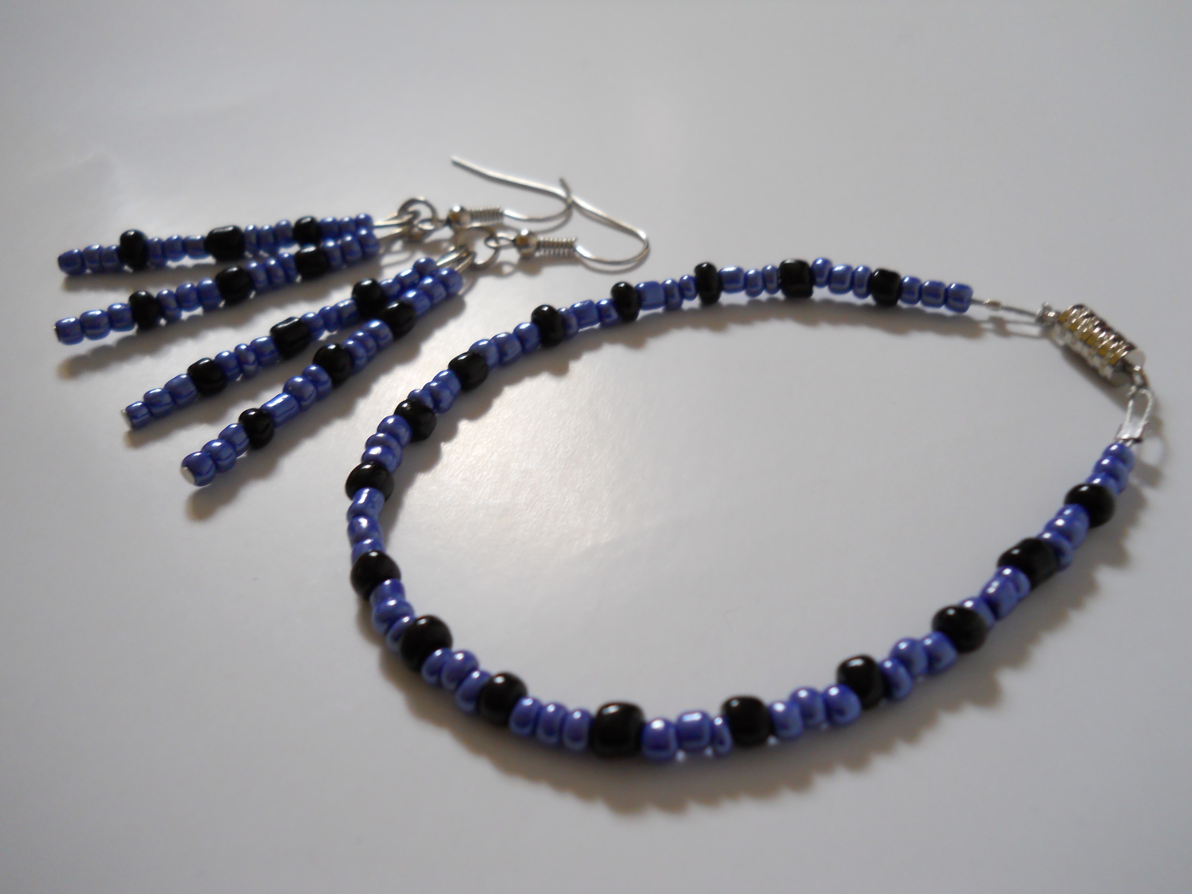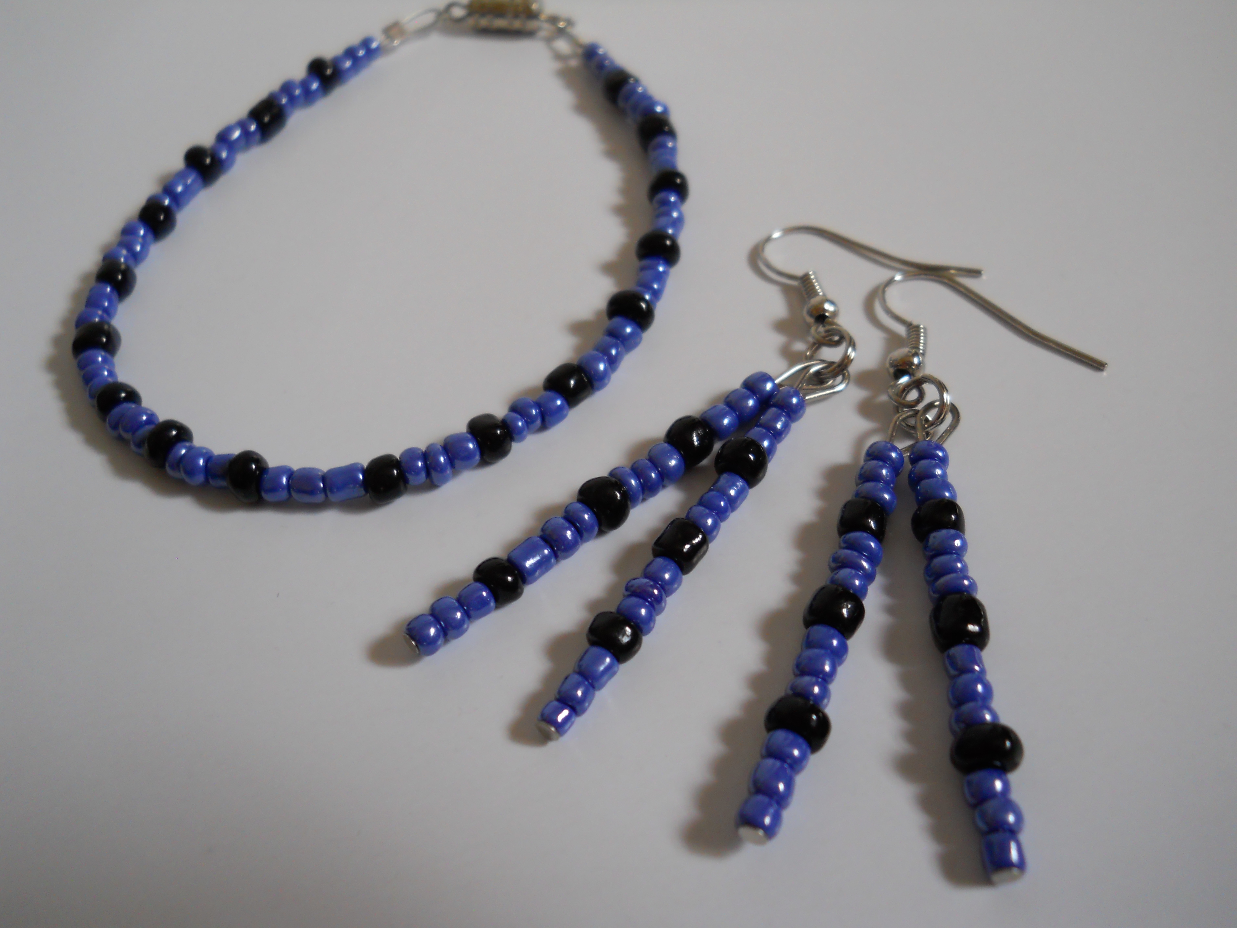A distinguishable mix, this bracelet and earrings set is all handmade with shiny Black and Blue Czech Glass E-Beads! Bracelet is connected with a Barrel Clasp and earrings with fish/french Hook Wire