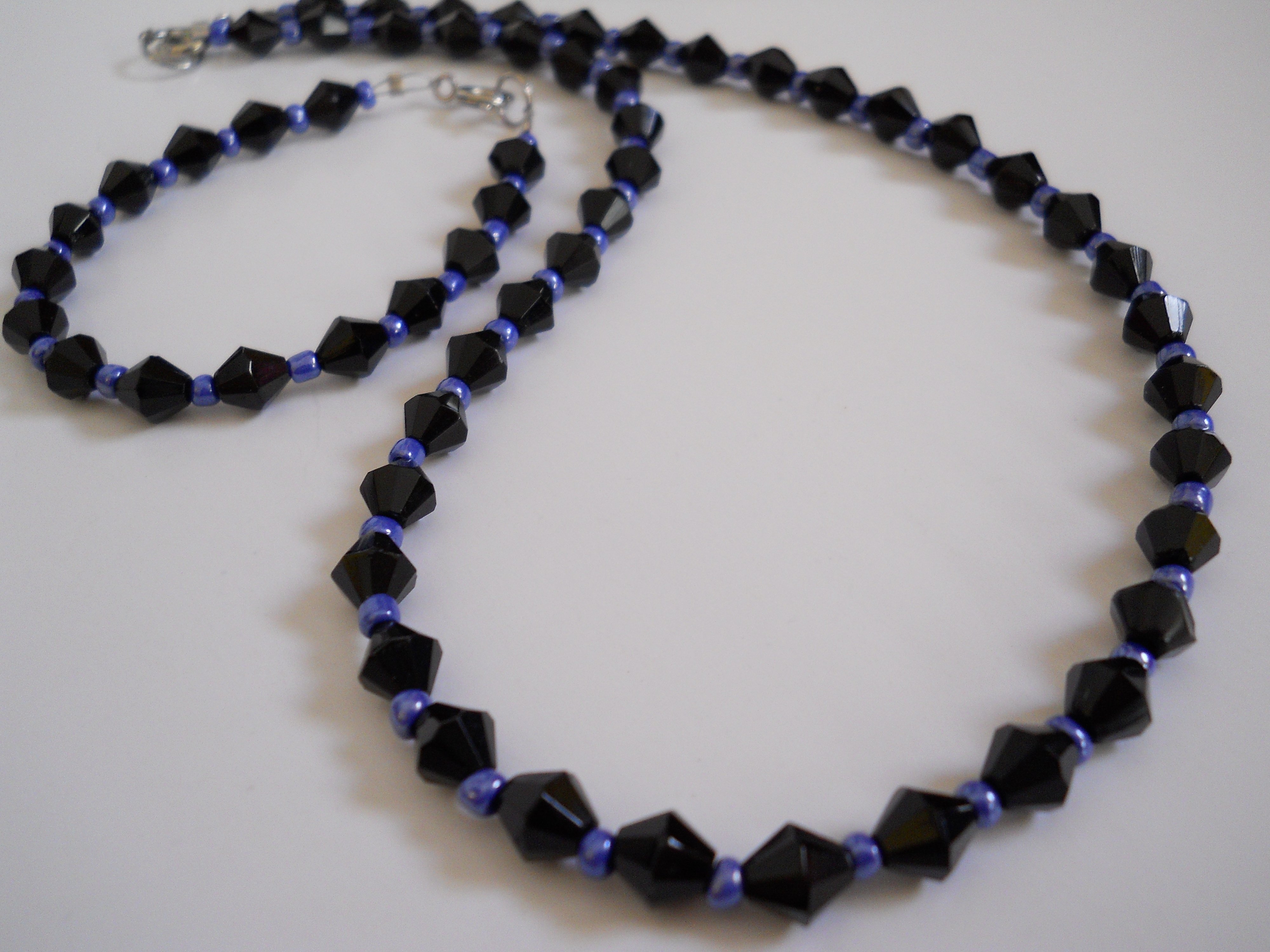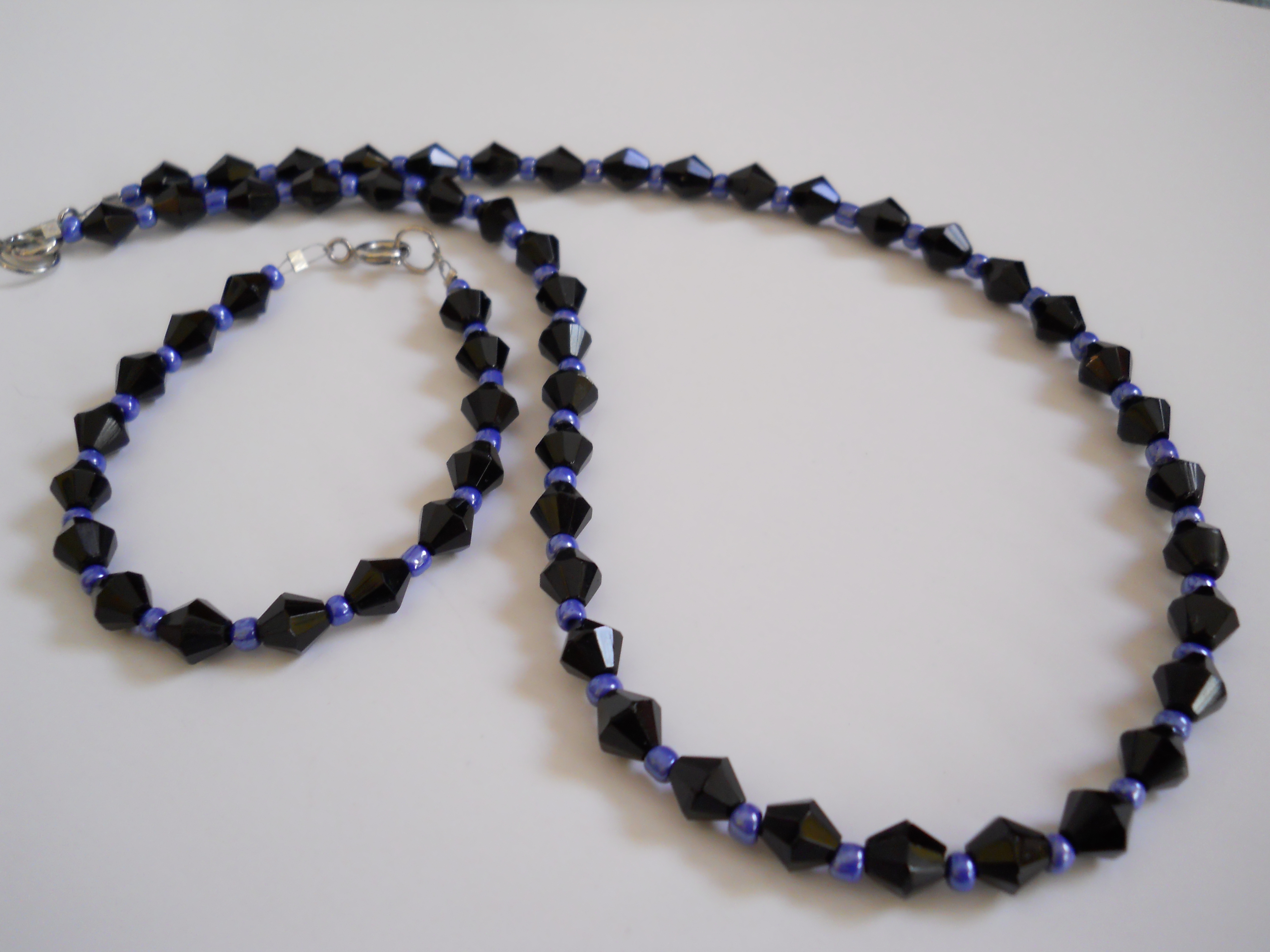 This beautiful necklace and bracelet set is all handmade with brilliant Blue Czech Glass E-Beads and sparkling Black Bicone Crystal Beads! Both are connected by Spring Ring Clasps