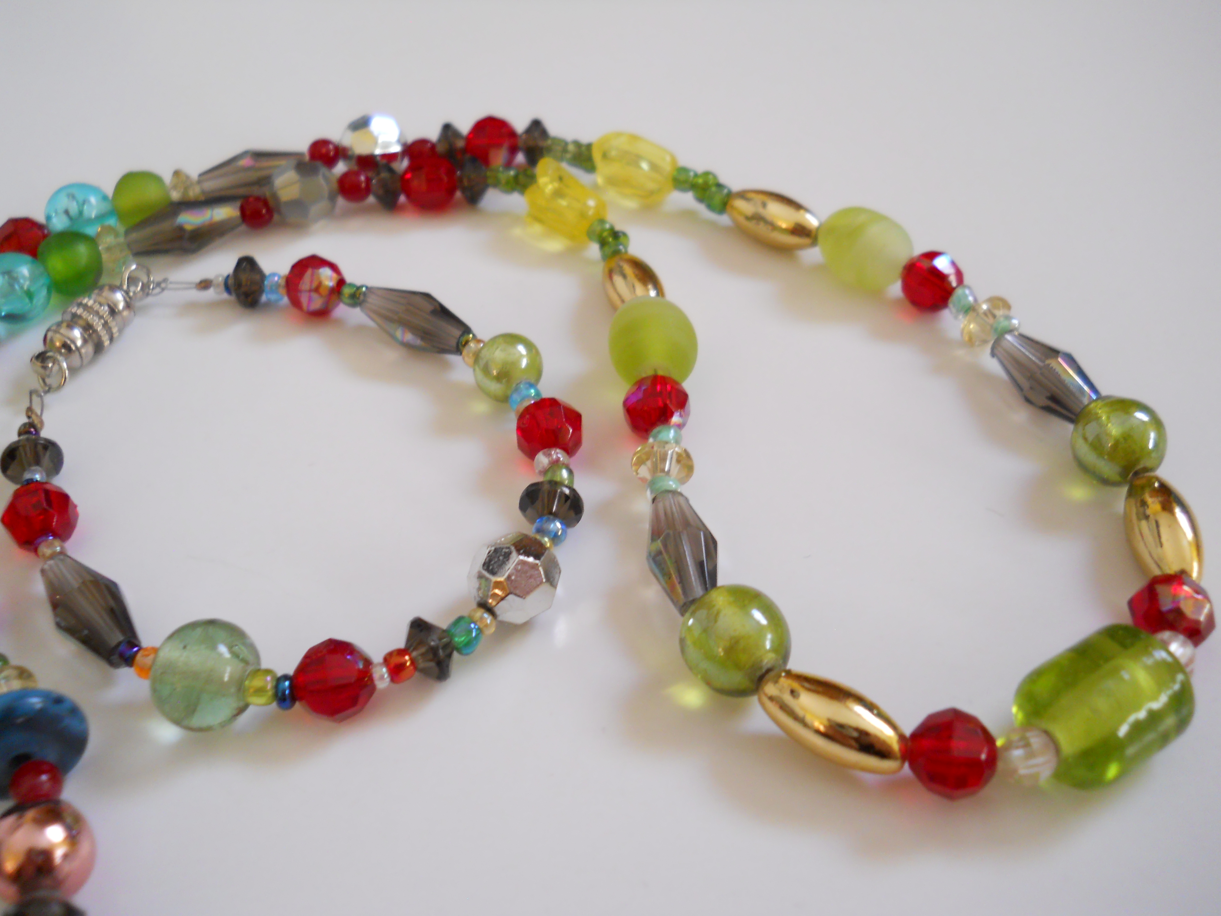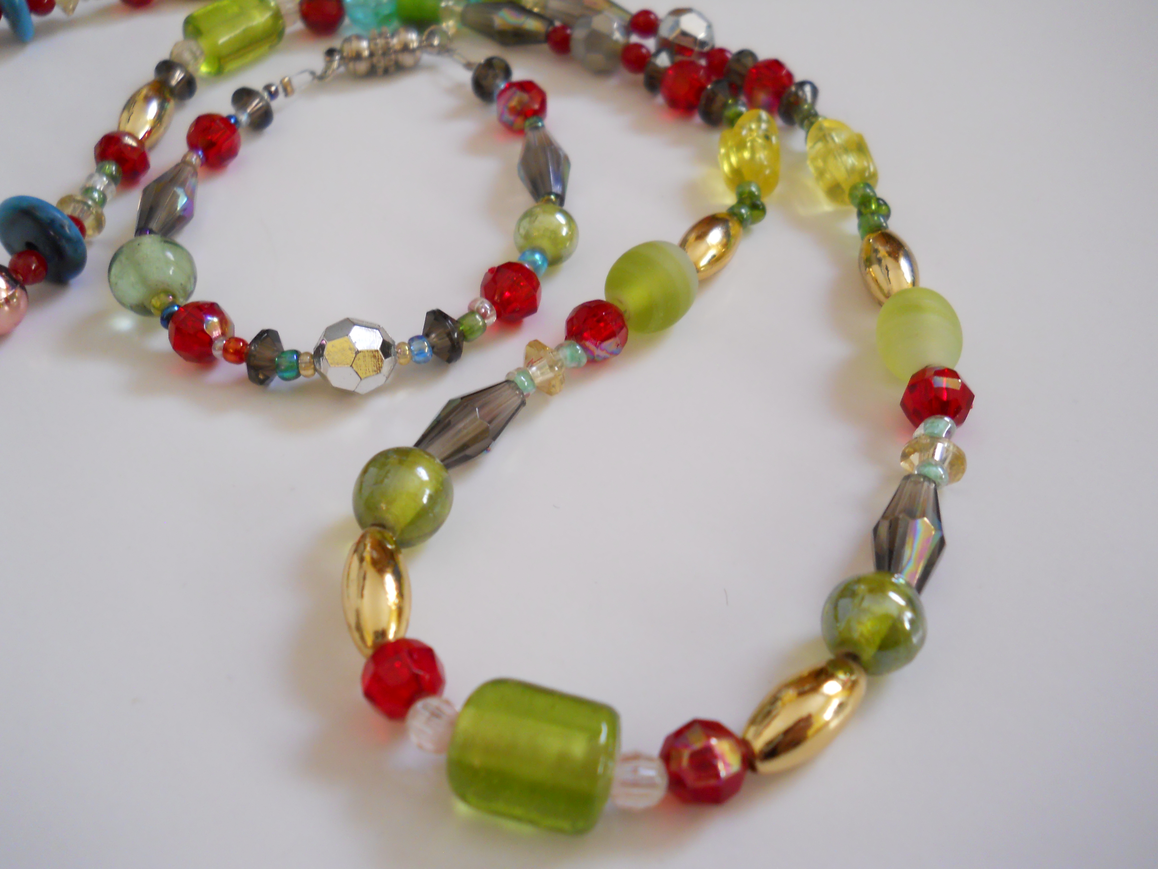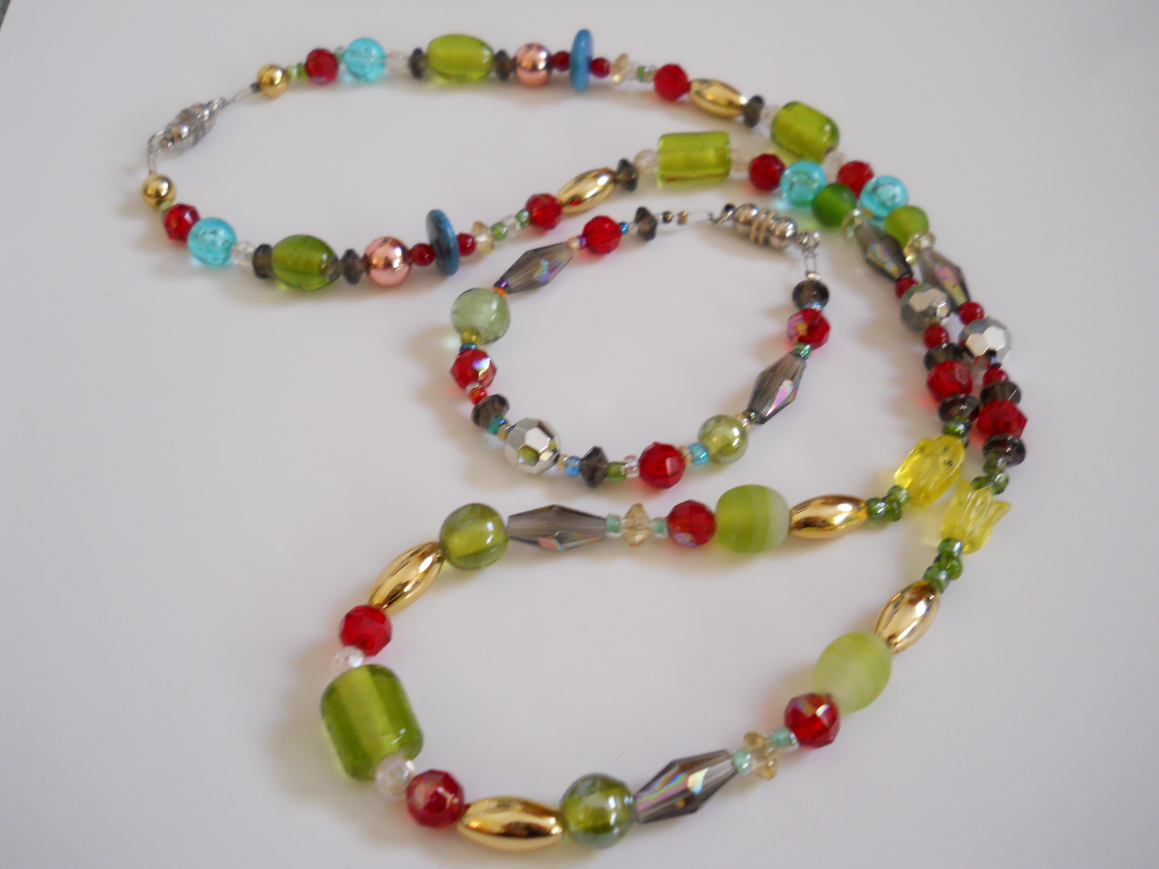 All Handmade with Czech Glass E-Beads, Green Glass Beads and Red, Gray and Gold Acrylic Beads! Necklace and Matching Bracelet are connected with Magnetic Clasps