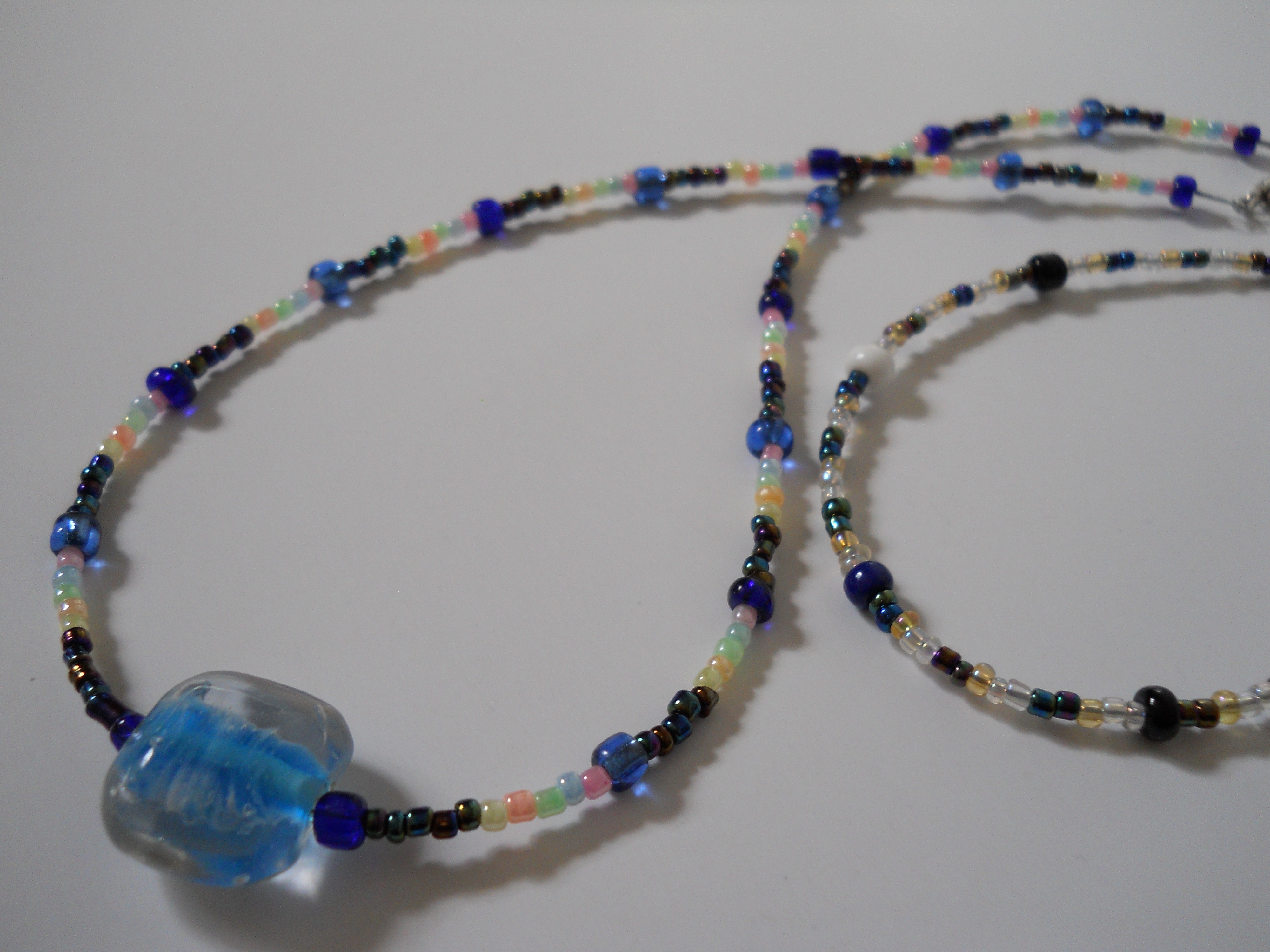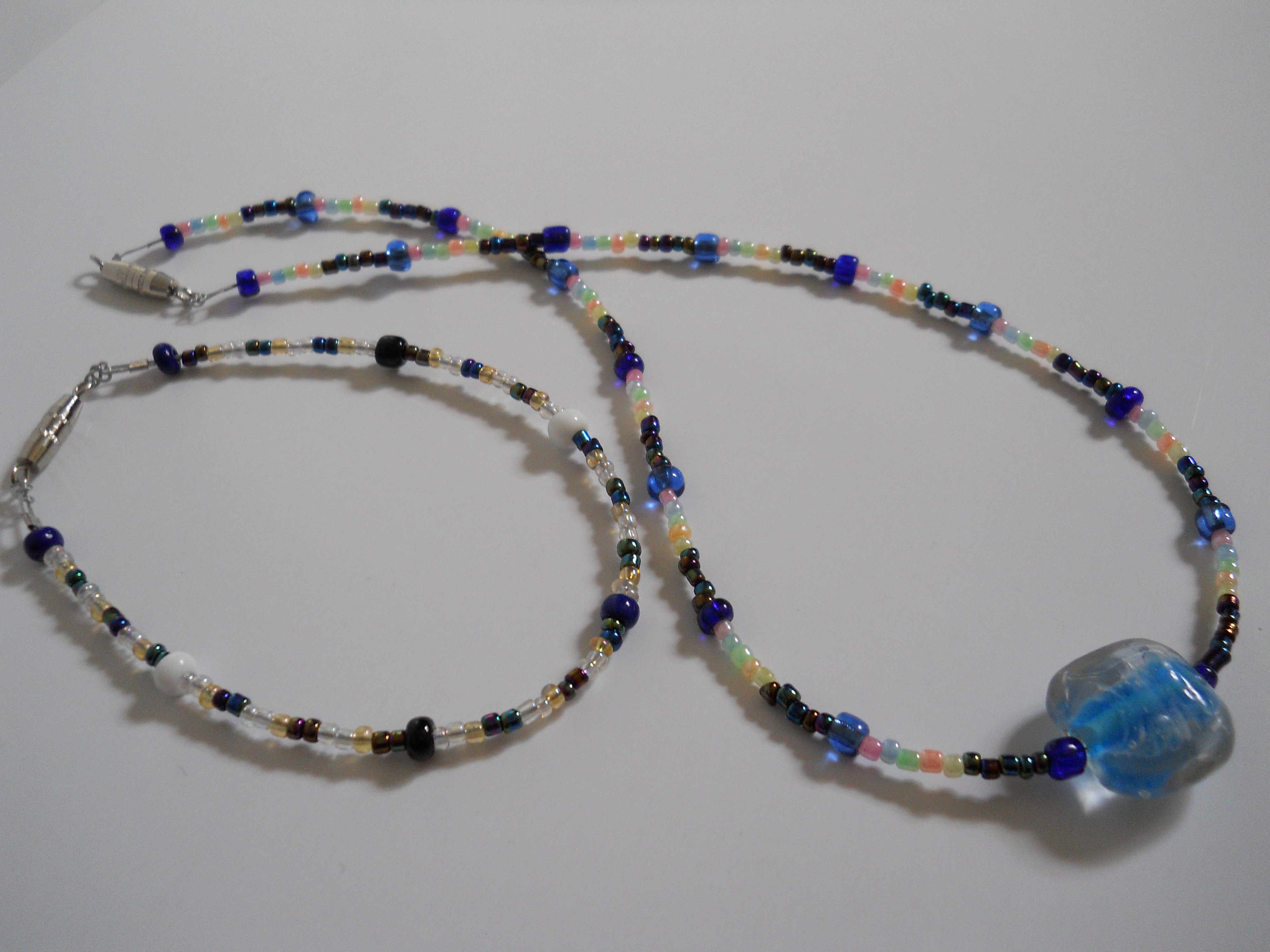 All Handmade with Blue, White and Black Czech Glass E-Beads and Pastel and Metallic Seed Beads, centered by a Clear Blue Glass Bead! Connected with Torpedo Clasps