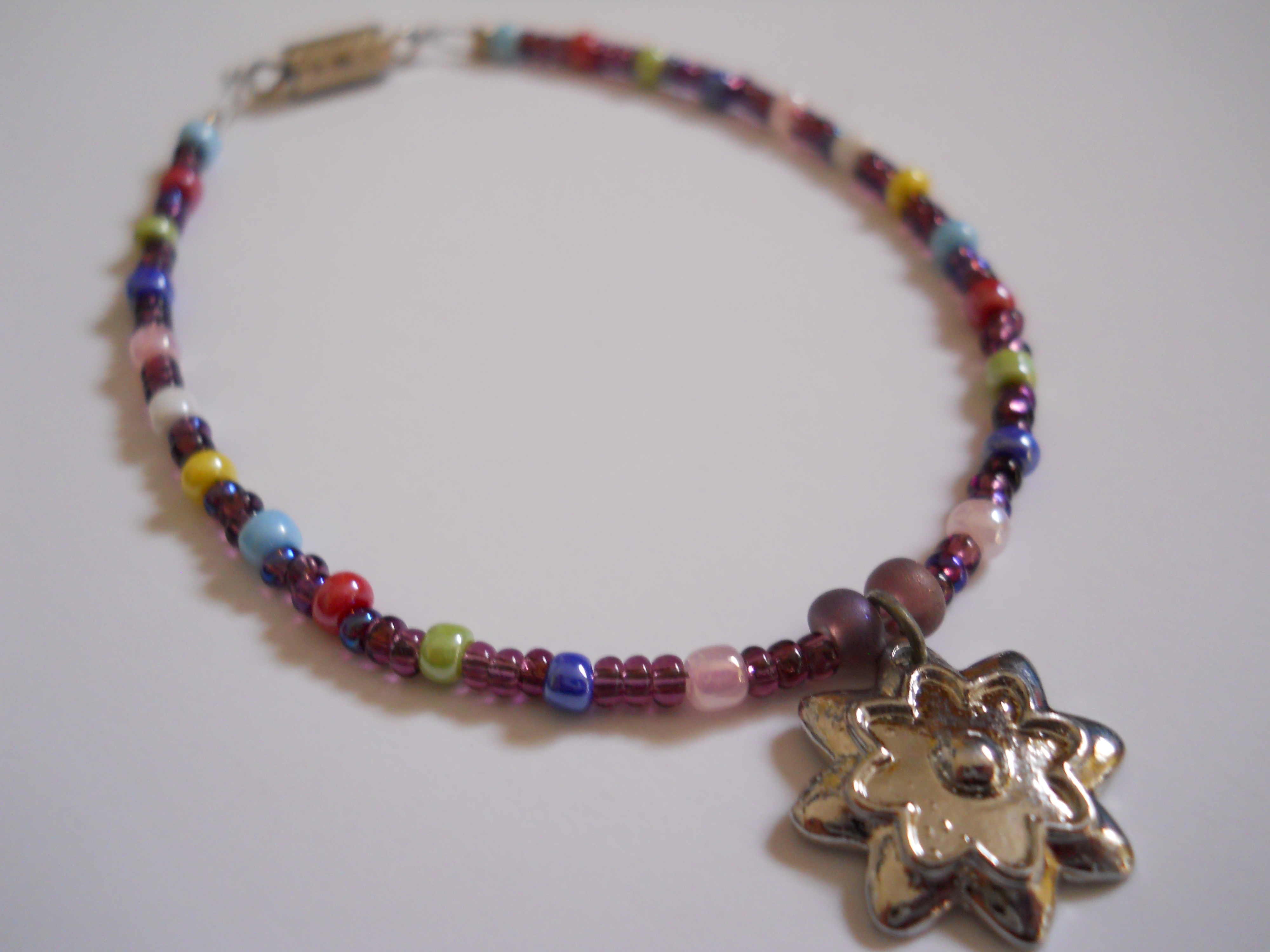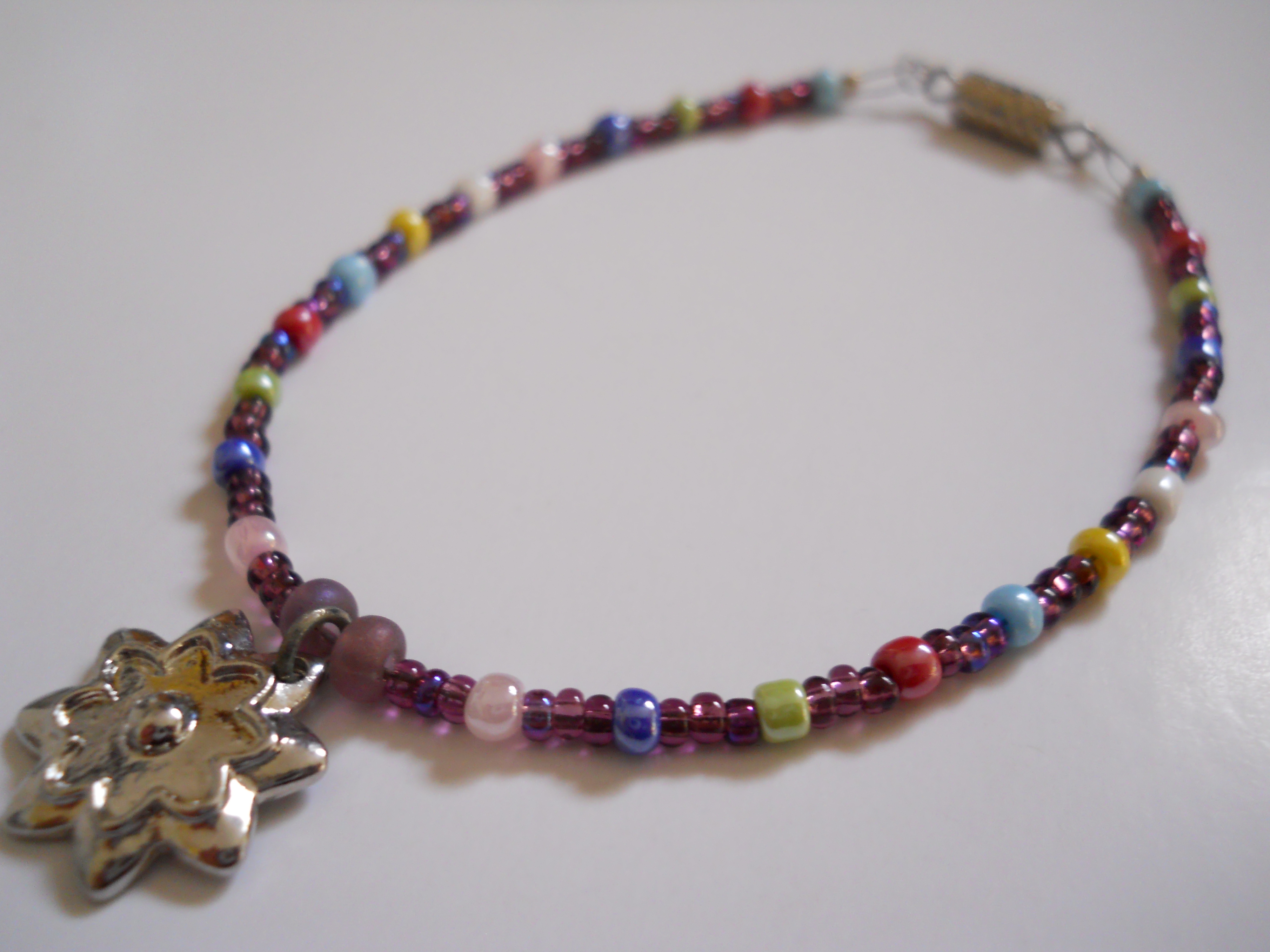 All Handmade with Purple Seed Beads and Assorted Colored Czech Glass E-Beads, centered with a Silver Metal Flower Charm! Connected by a Barrel Clasp