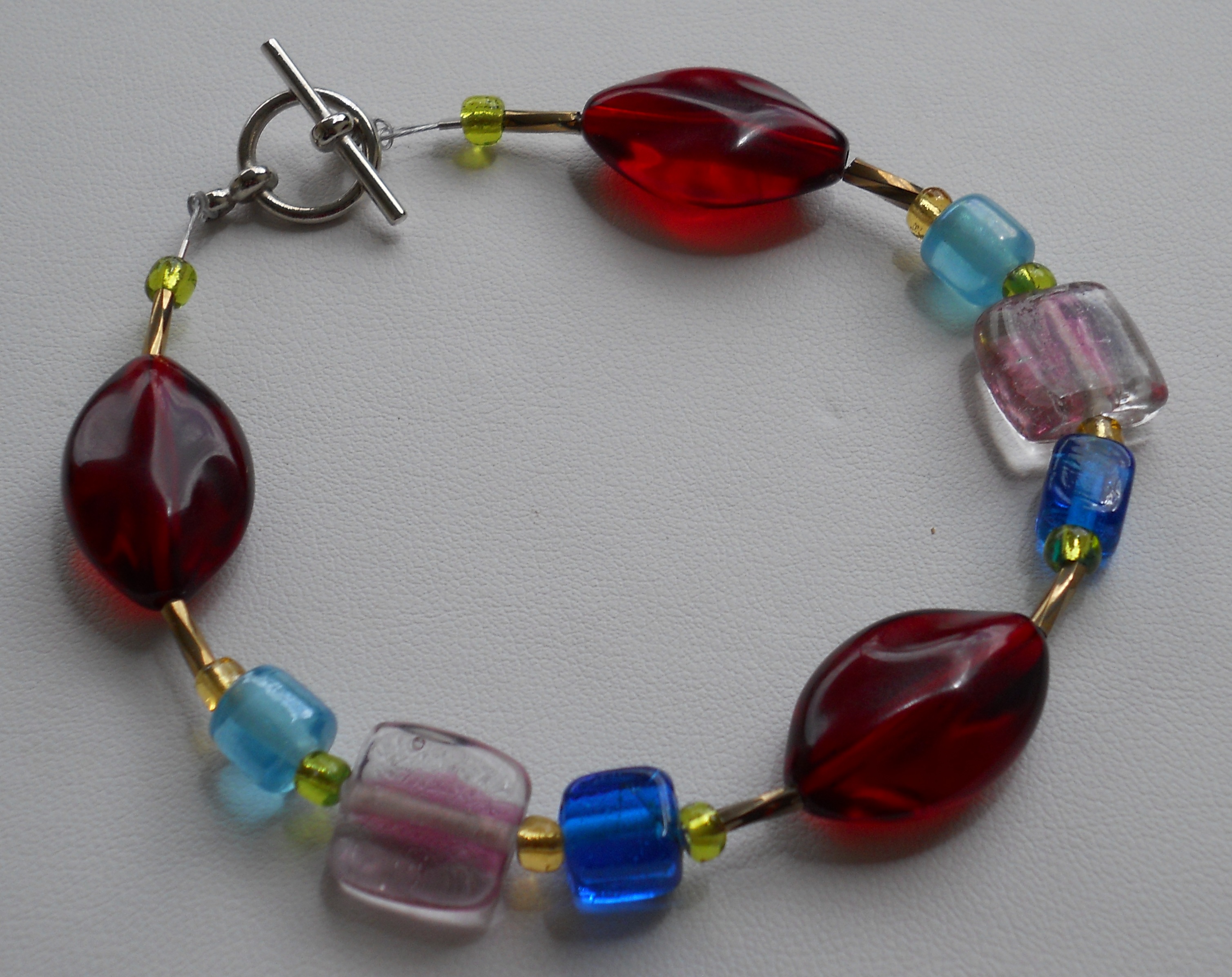 All Handmade with Pink and Blue Glass Beads, Yellow and Green Czech Glass E-Beads, Gold colored Bugle Beads, and Red Acrylic Beads! Connected with by a Toggle Clasp