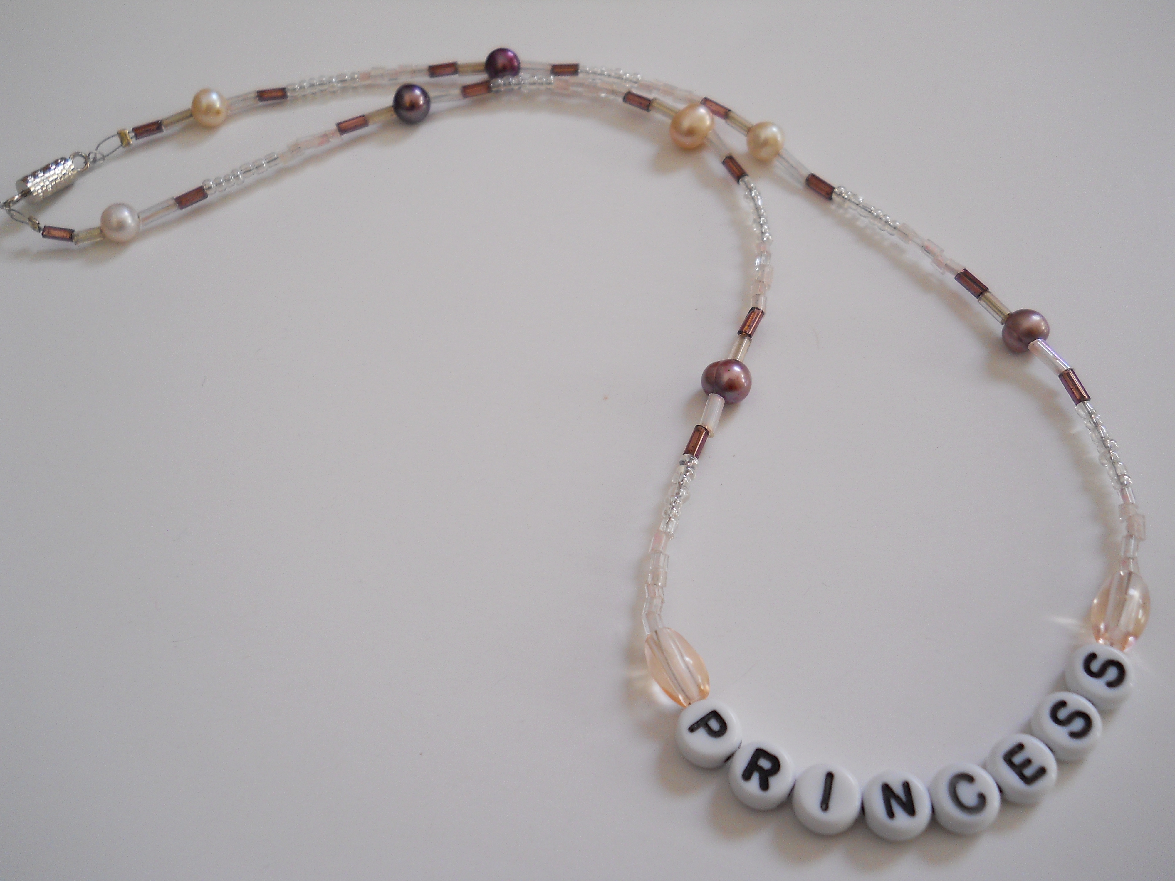 Be a Princess with this necklace! Handmade with Pink and Purple Bugle Beads, clear seed beads, pink chip beads and Glass Pearl Beads, centered with Acrylic Letter Beads. Connected by a Barrel Clasp