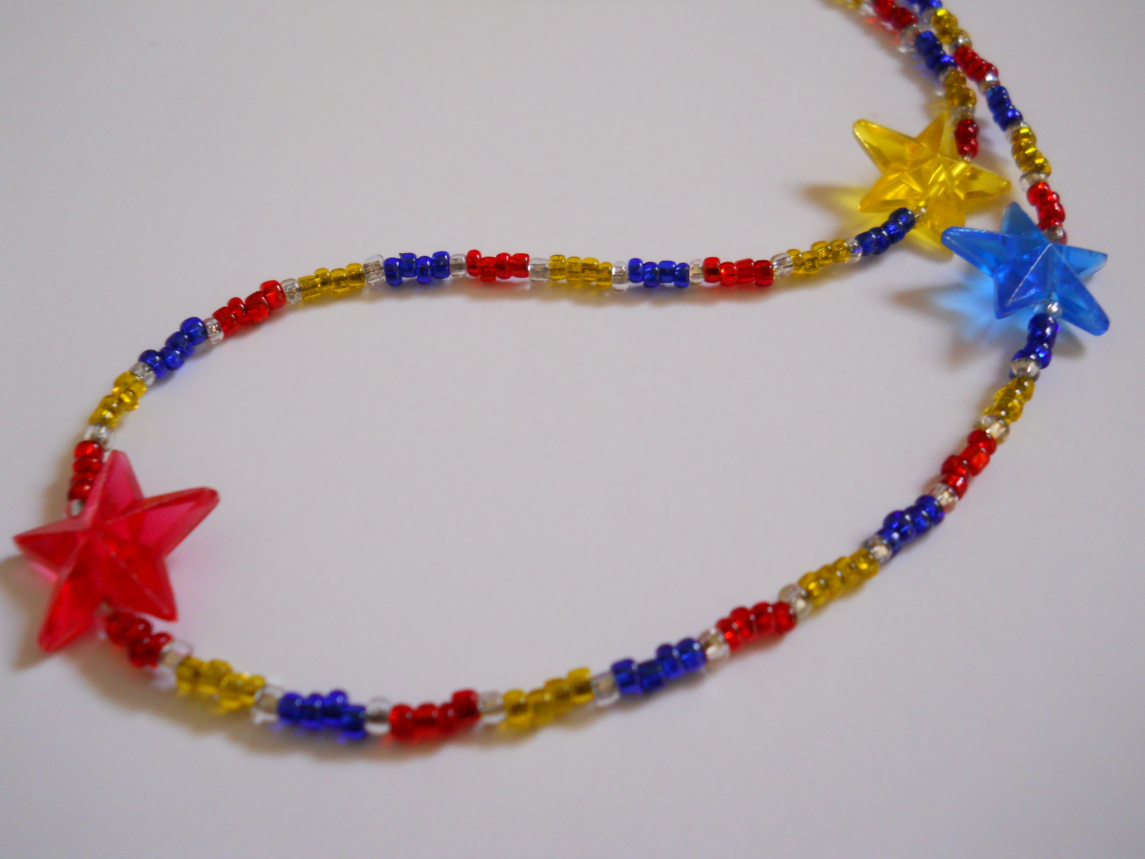 This adorably cute necklace is all Handmade with Red, Blue, Yellow and Silver Seed Beads, intermingled with Yellow, Blue and Red Acrylic Star Beads! Connected with a Spring Ring Clasp