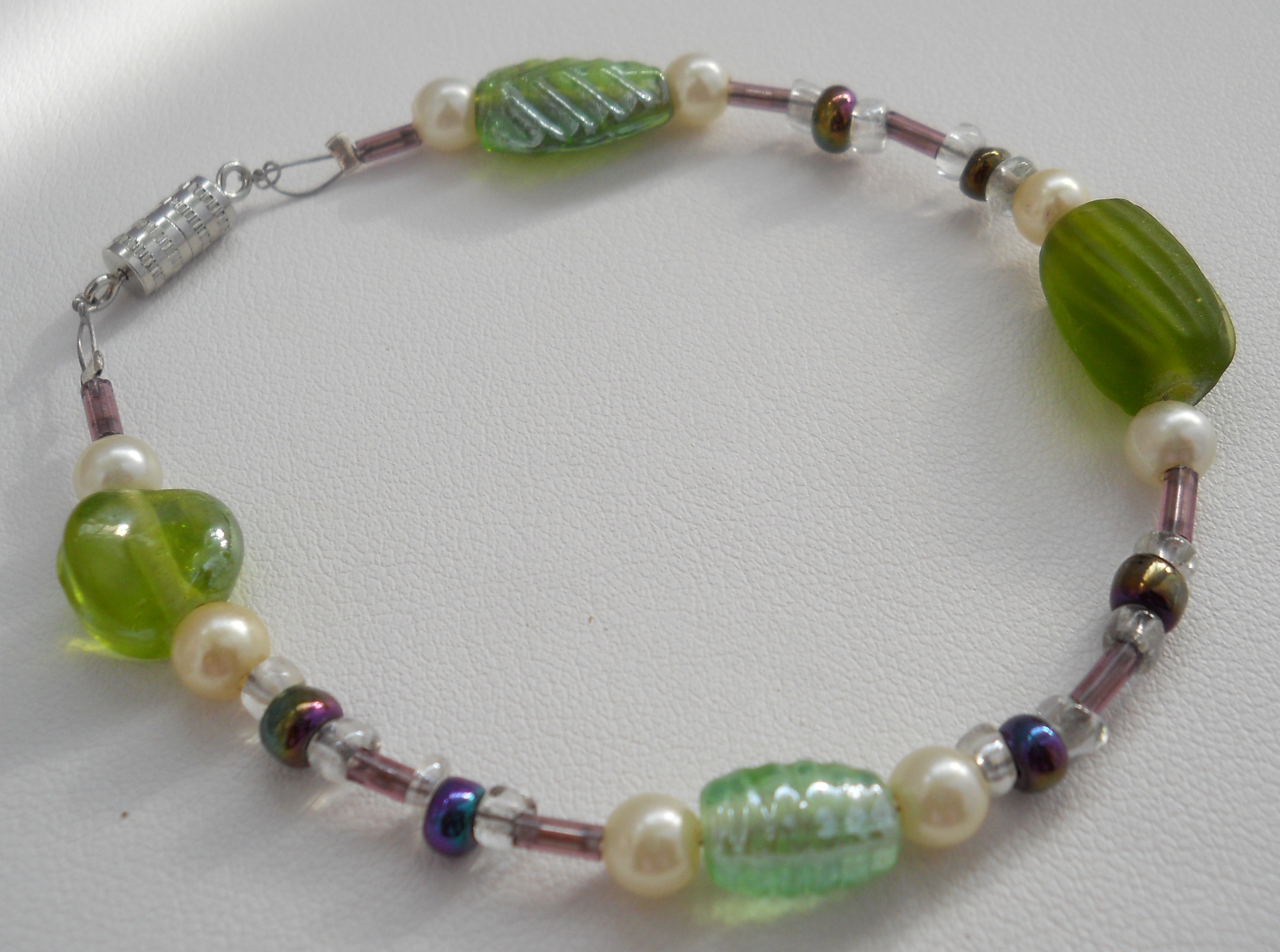 All Handmade with Faux Pearl Beads, Purple Bugle Beads, Metallic and Clear Czech Glass E-Beads and Green Glass Beads! Connected with a Barrel Clasp
