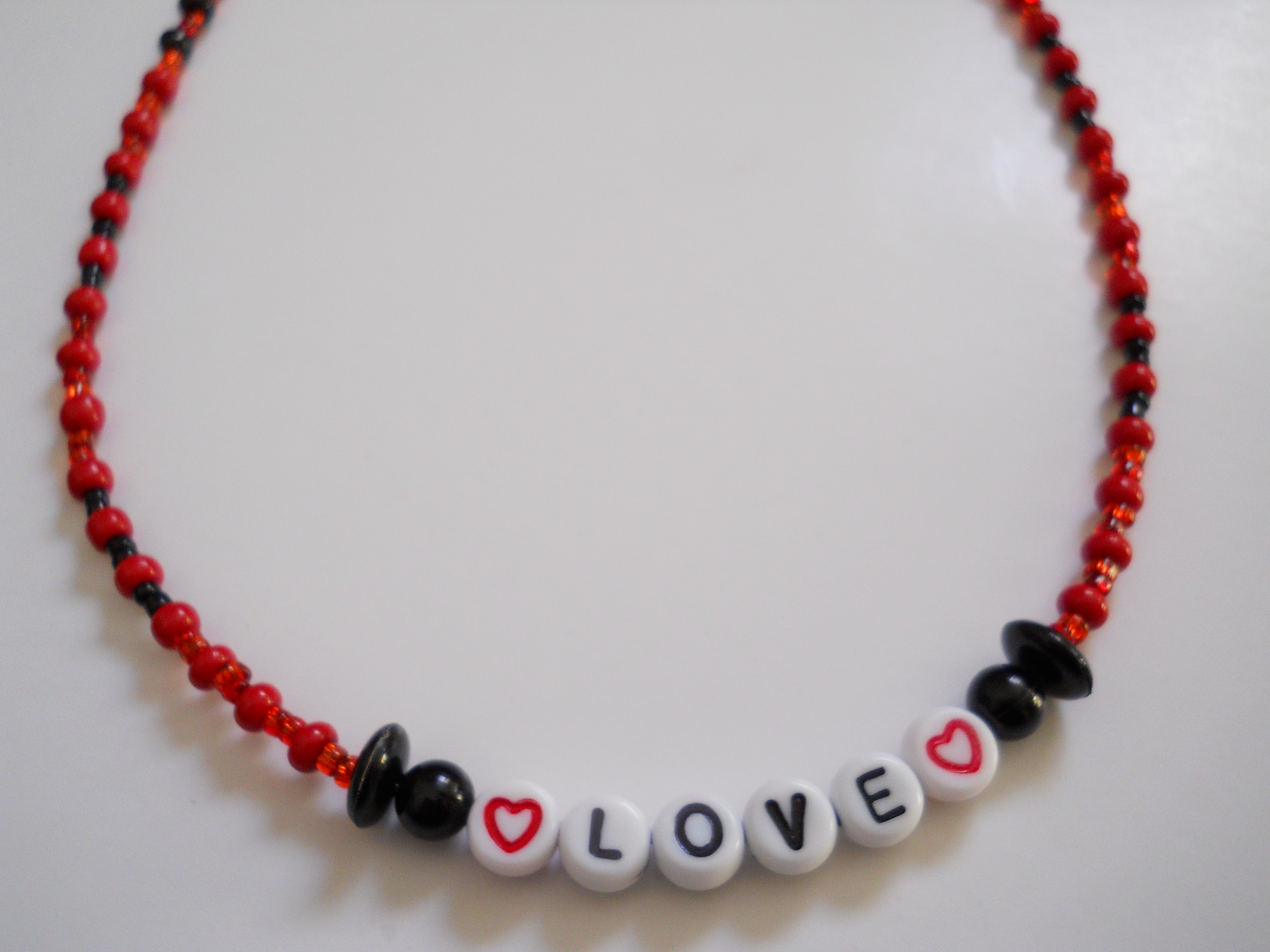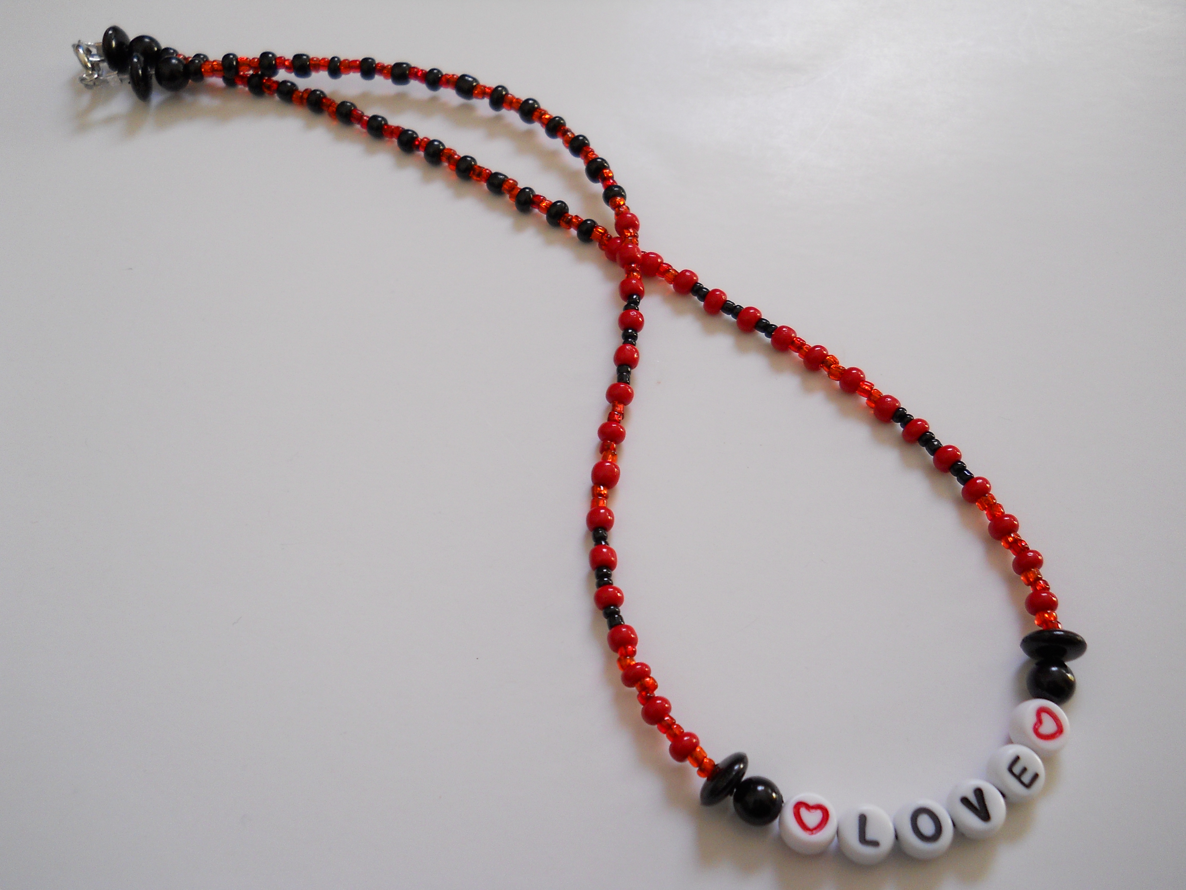 Spread the love with this cute necklace! Handmade with red seed beads, red and black Czech Glass e-beads, it is centered with Acrylic Letter Beads. Connected with a Spring Ring Clasp