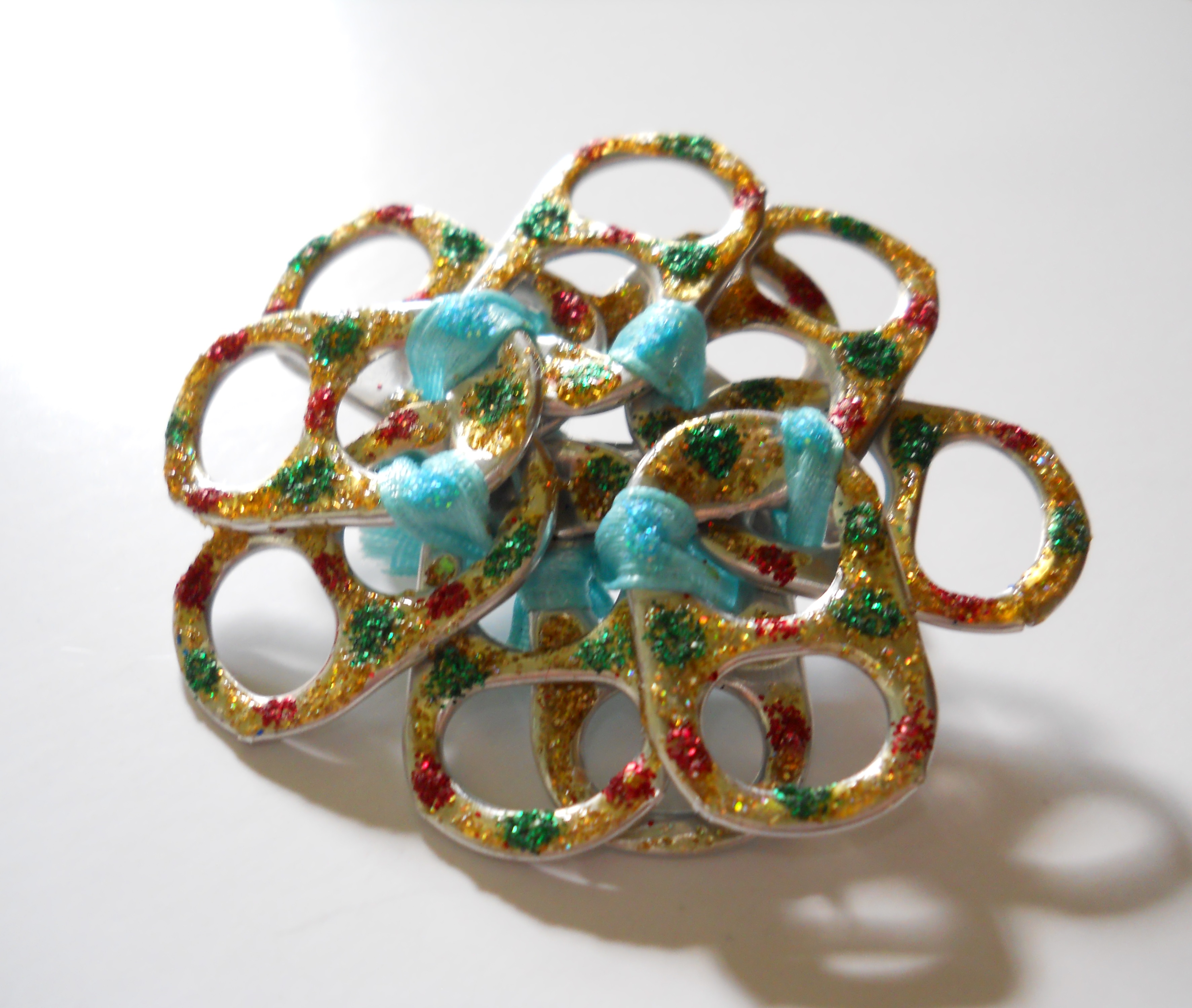 This beautiful pin is all handmade with aluminum tabs and decorated with Bright Blue ribbon, Blue Glitter Glue and Red, Green and Gold Glitter Glue!